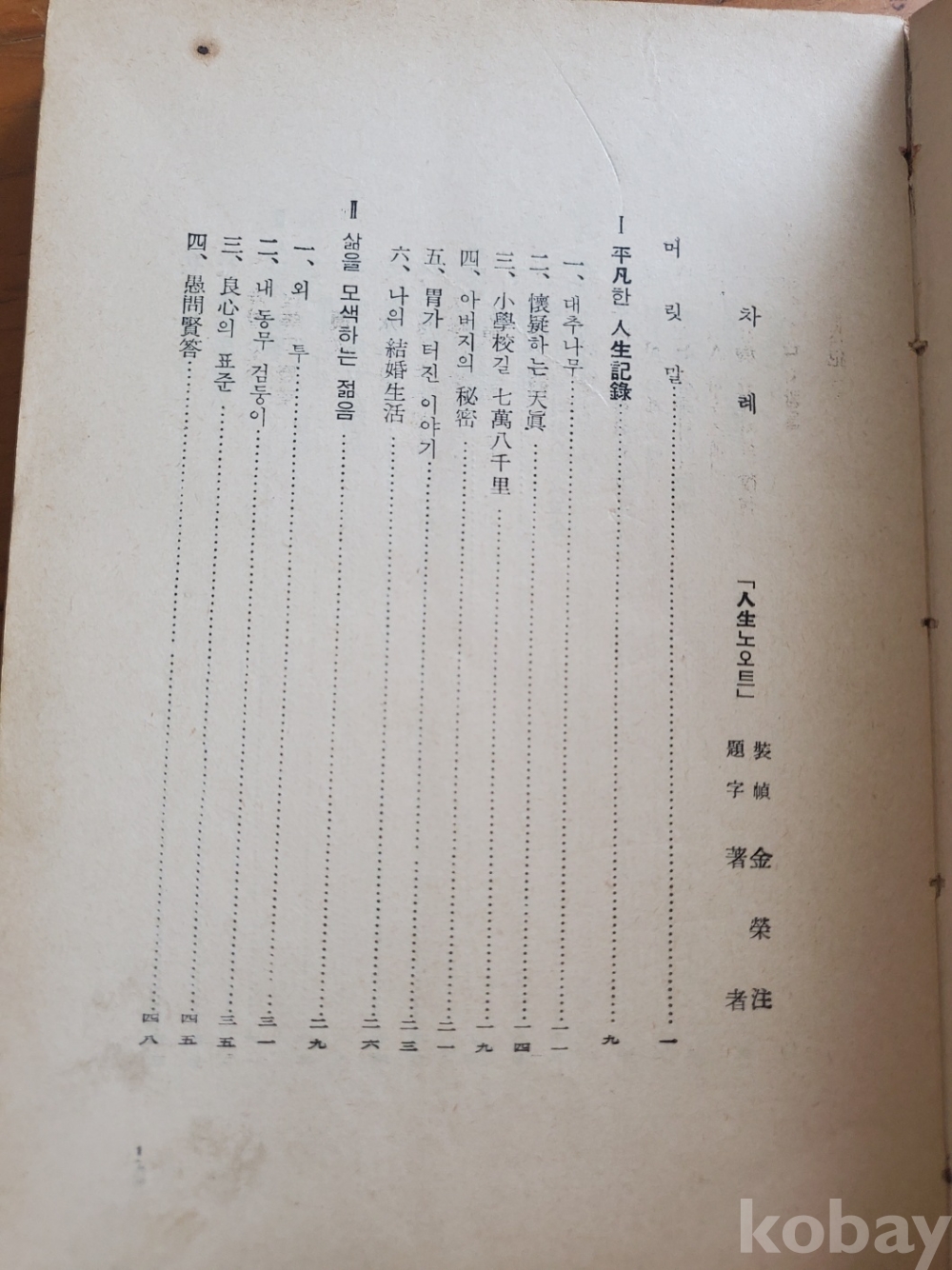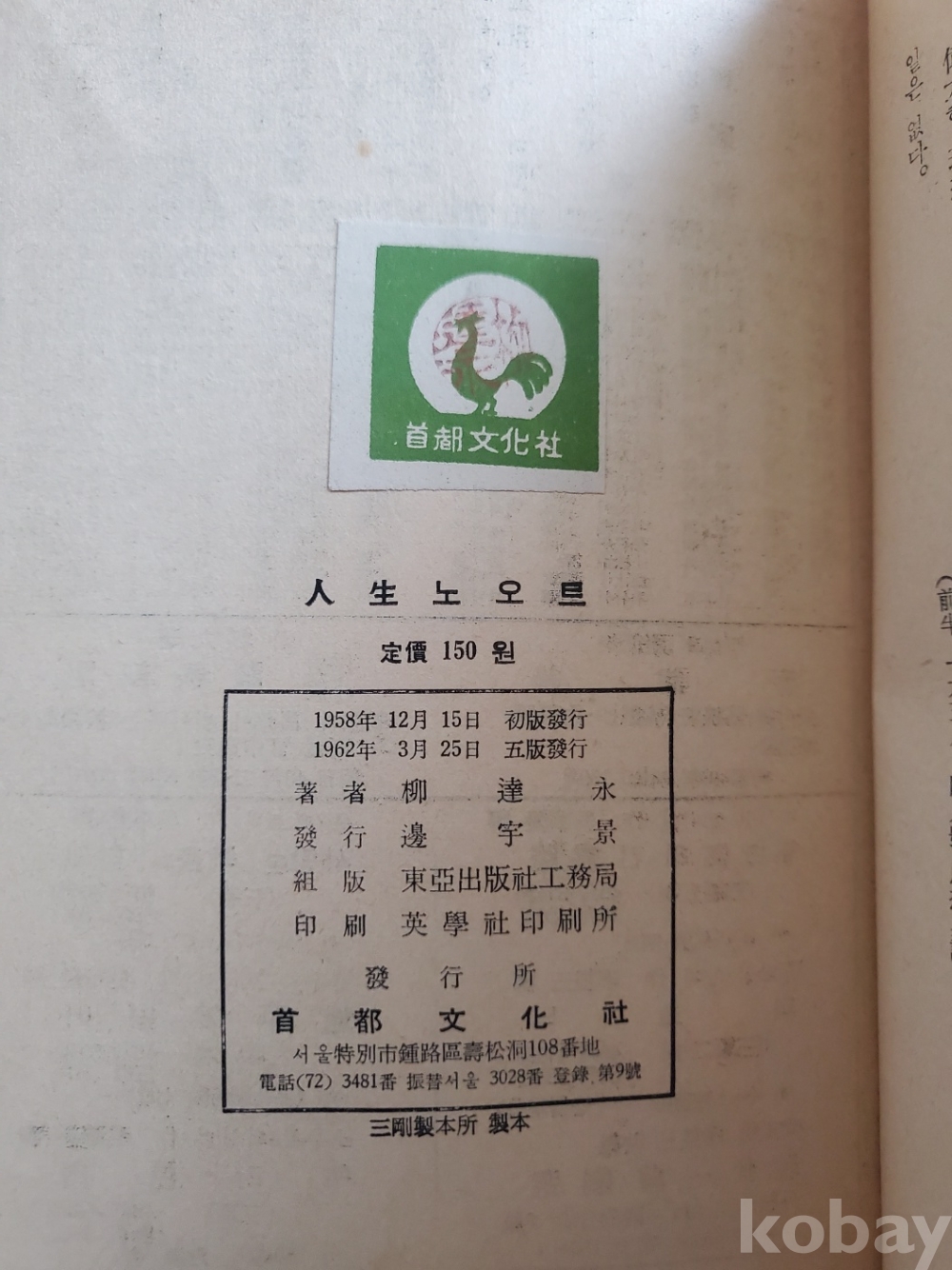 1. 인생노오트, 류달영, 수도문화사, 1962년, 406쪽, 상태 상, 사진 참조