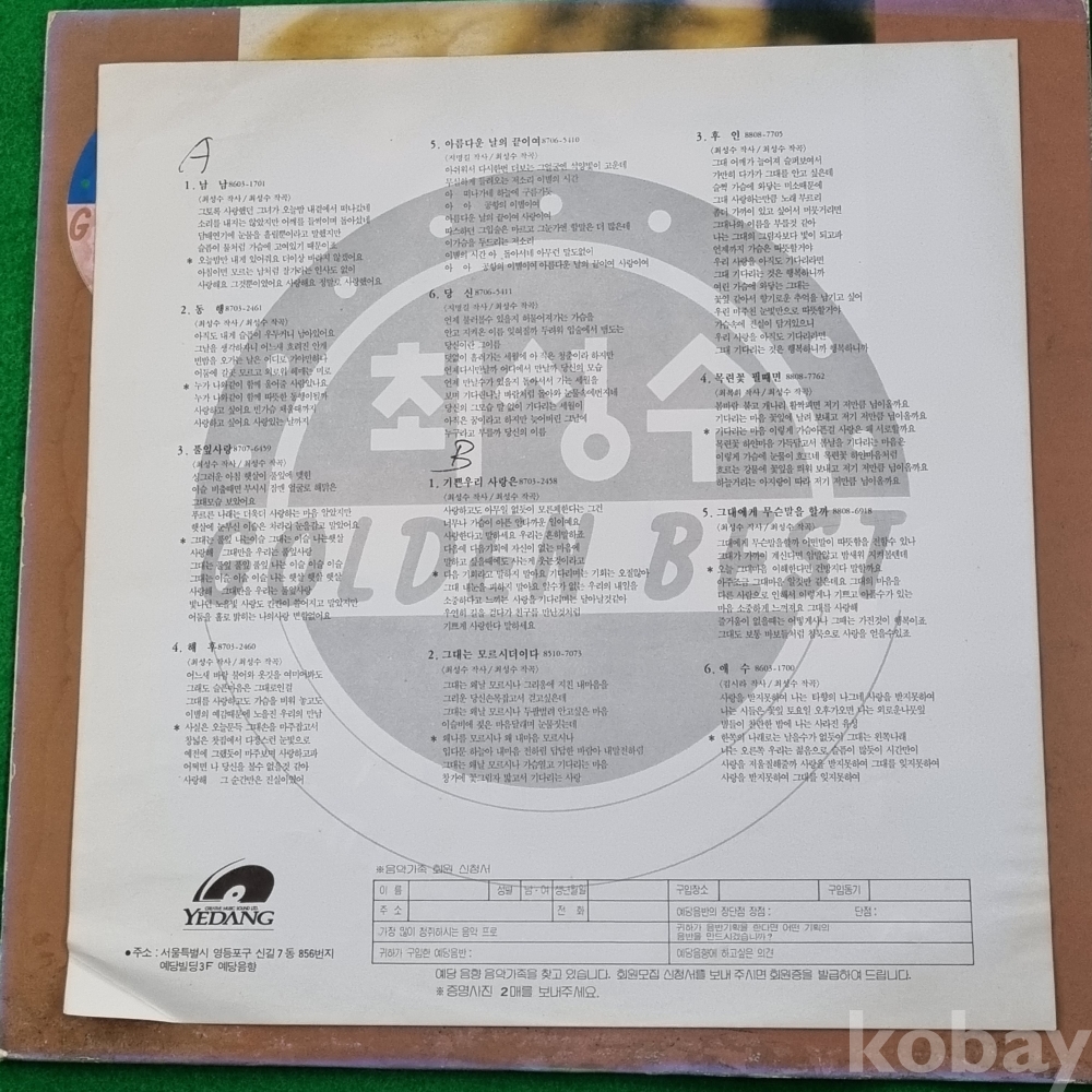 | 자켓상태 | EX : 약간의 마모, 모서리 찢김 존재 | 음반상태 | EX : 재생에 영향 없는 가벼운 기스 존재 | 발매정보 | 알수없음 | 가사지여부 | 유 |