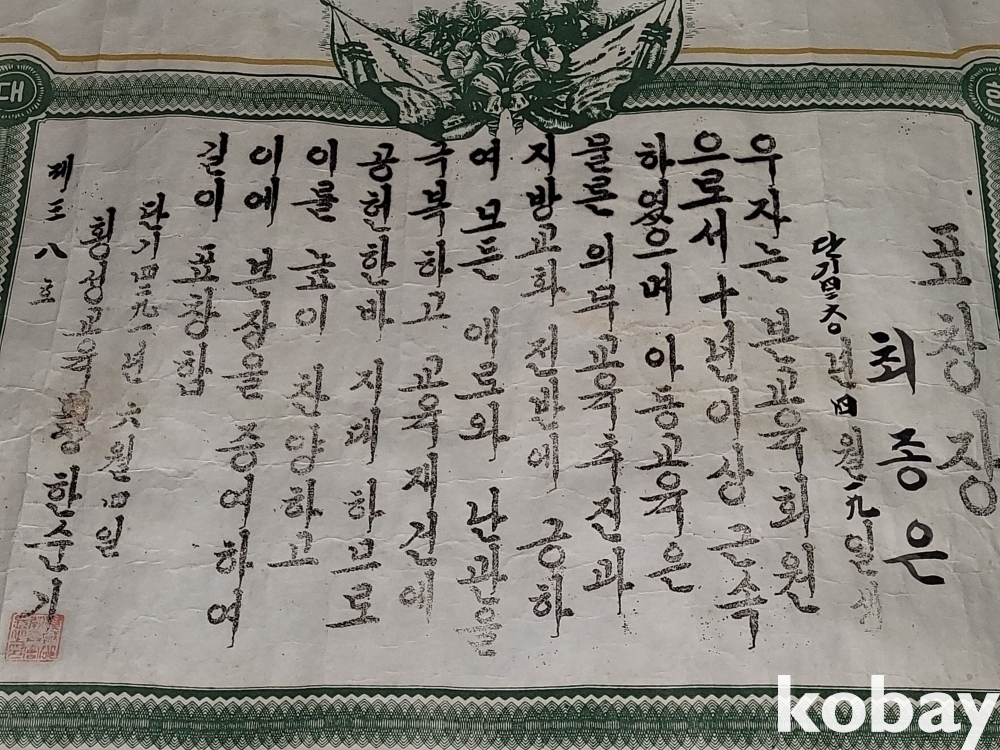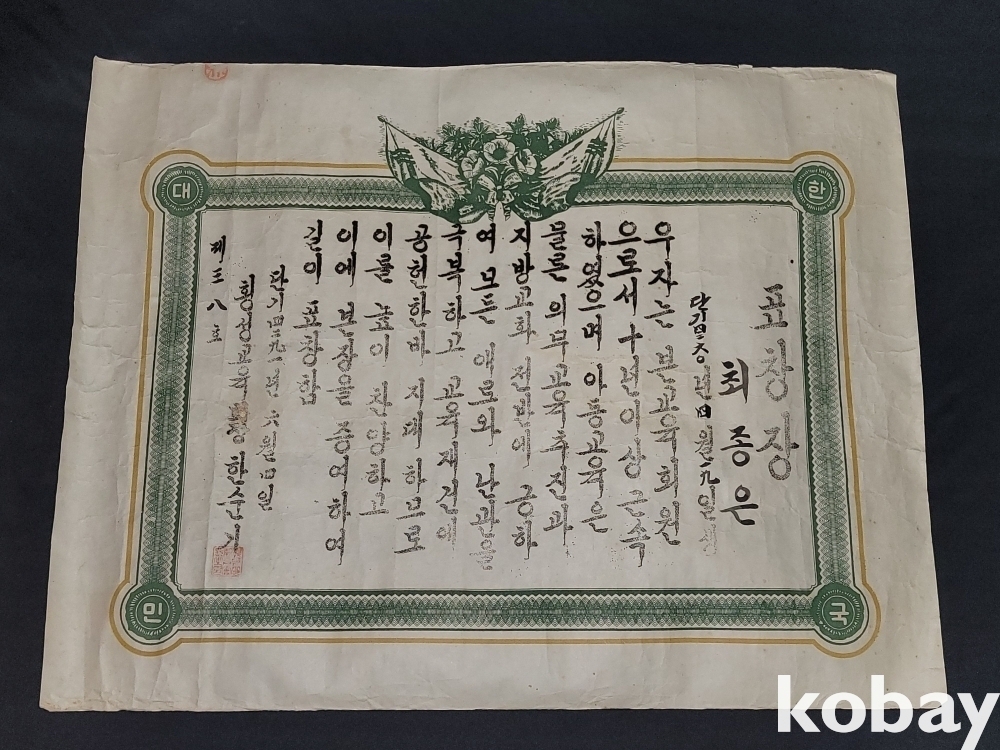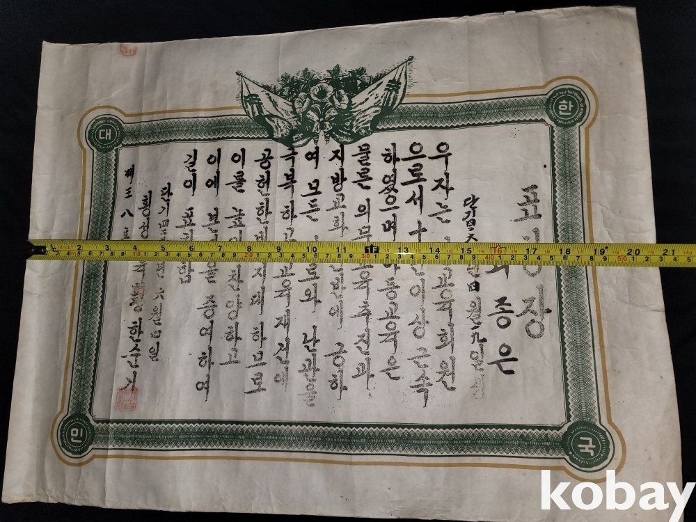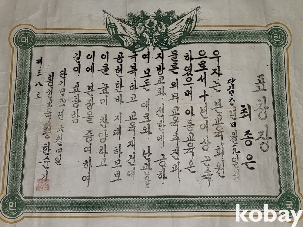 빈티지 세월 감이 느껴지는 1958년 희귀한 횡성교육회장 표창장 자료입니다.