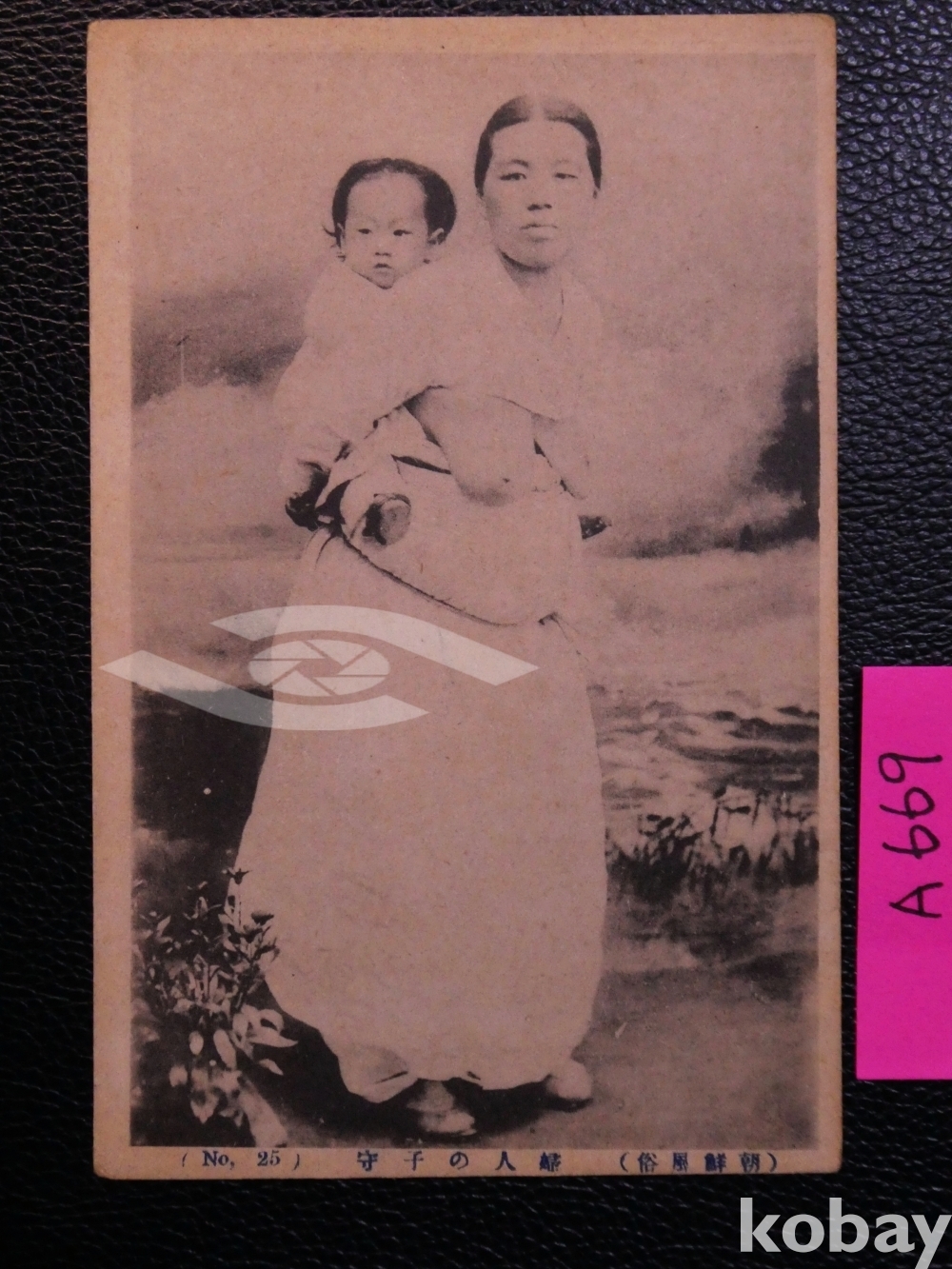 ▣근대한국엽서(진본): [조선풍속] 가슴을 드러내고 아기를 업고 있는 여인/1매/역사자료/일제강점기 사진엽서, 그림엽서, 회엽서. A669