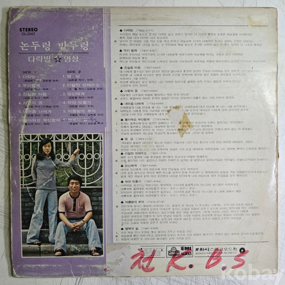| 자켓상태 | VG : 주름, 접힘, 모서리 찢김 다수 | 음반상태 | VG : 생활 기스 다수, 가벼운 노이즈 존재 | 발매정보 | 초반 | 가사지여부 | 무 |