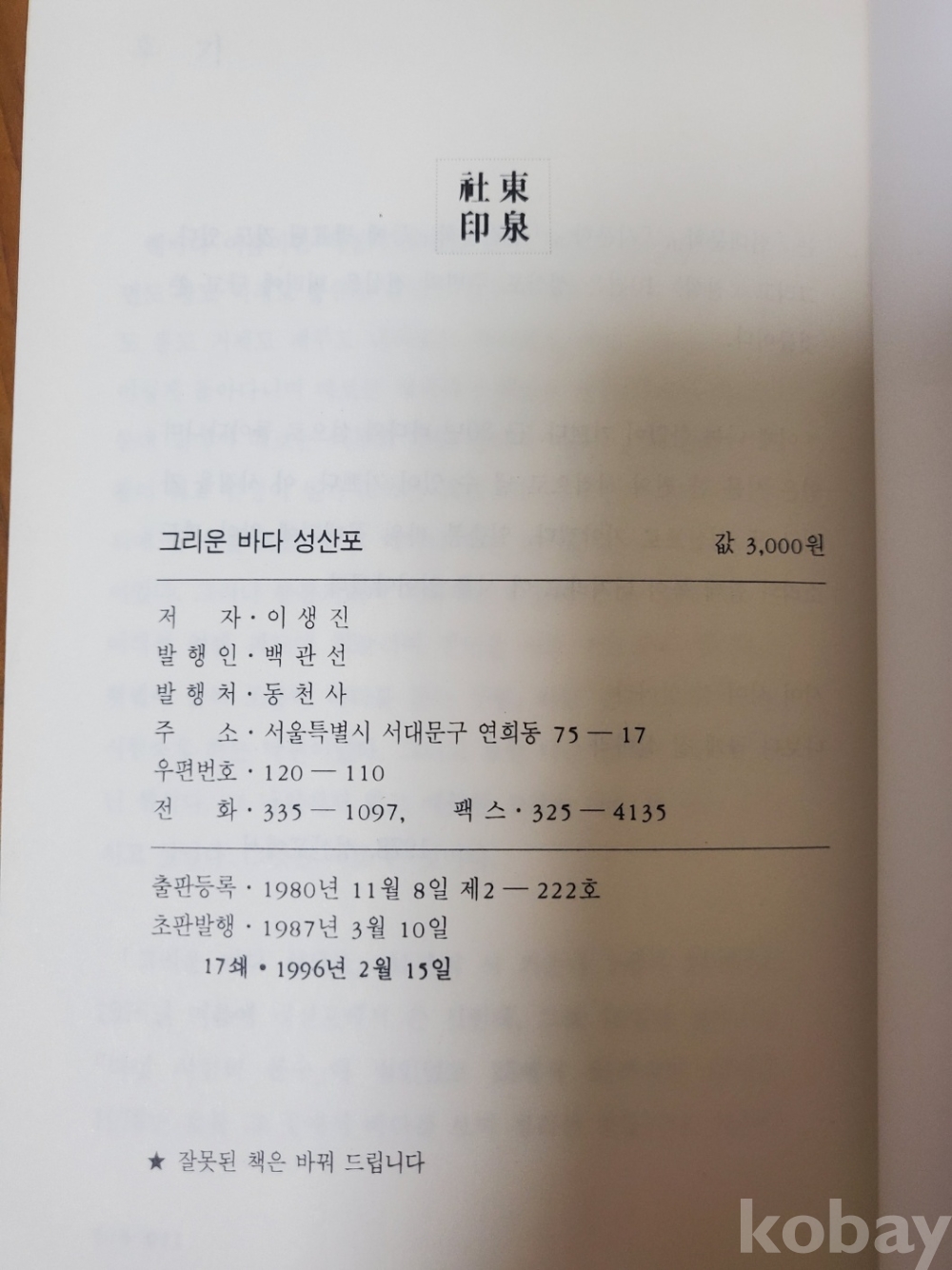 1. 그리운 바다 성산포, 이생진, 동천사, 1996년, 119쪽, 상태 상, 사진 참조