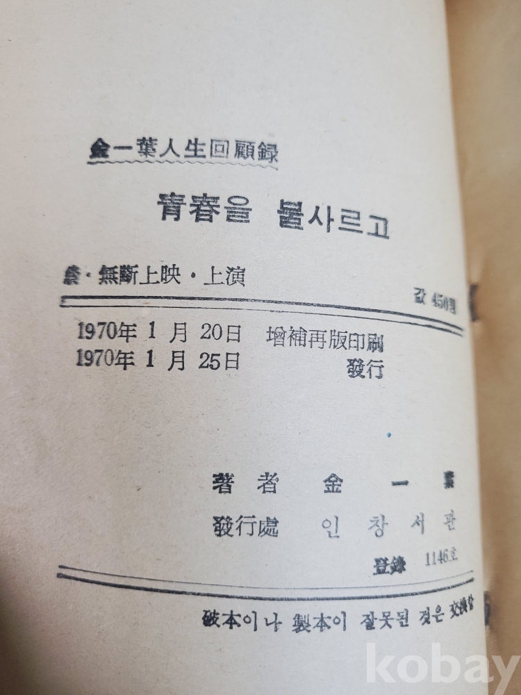 1. 청춘을 불사르고, 김일엽, 인창서관, 1970년, 378쪽, 상태 상, 사진 참조