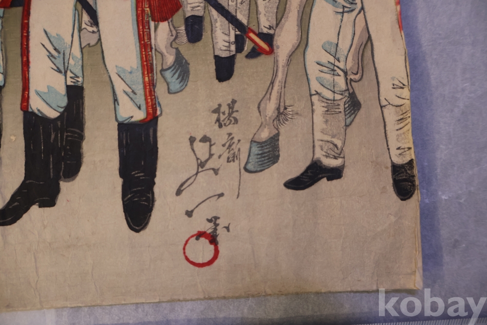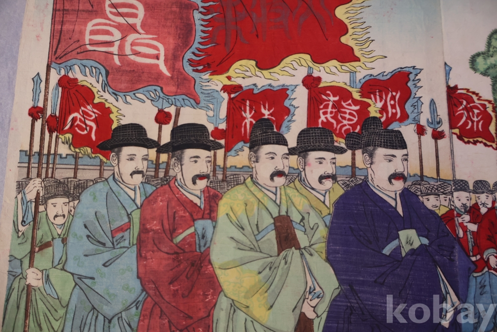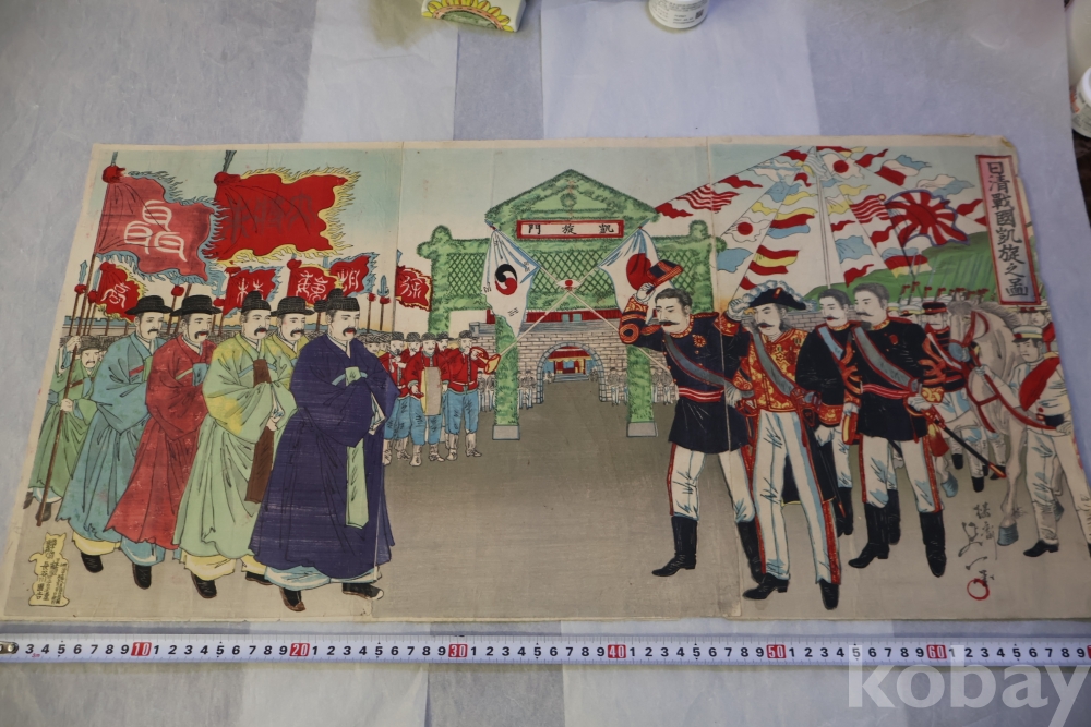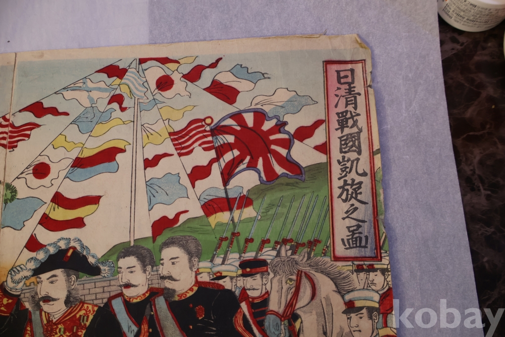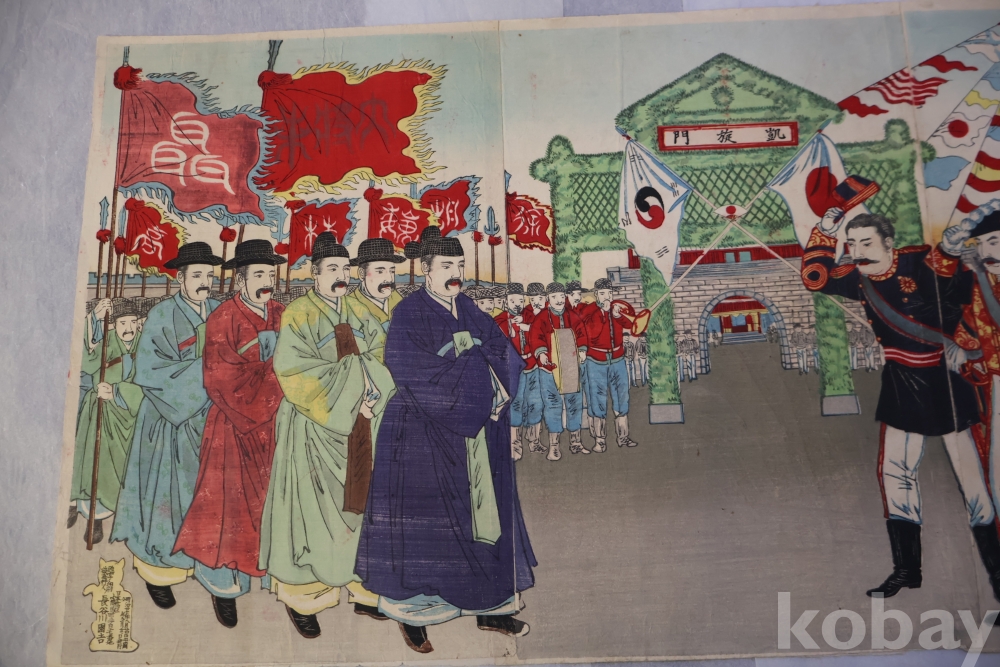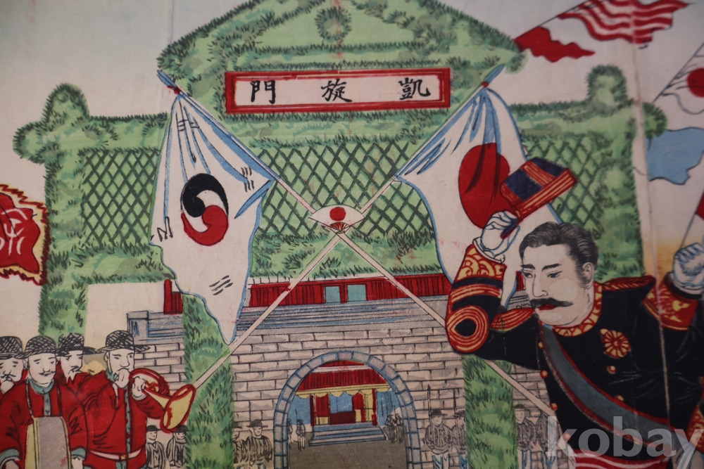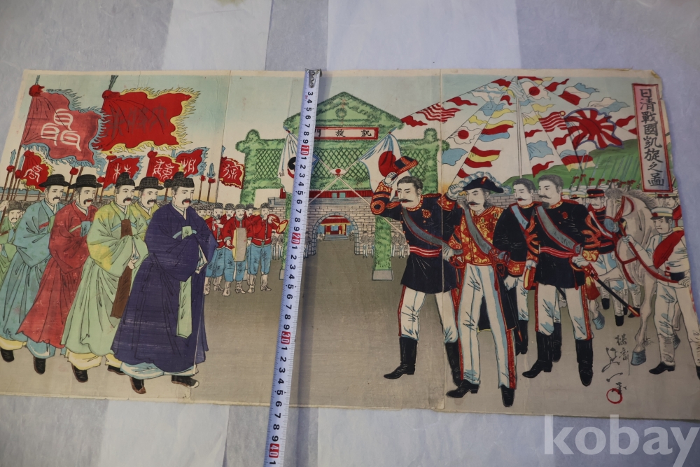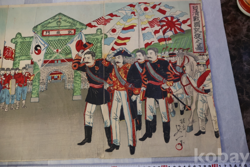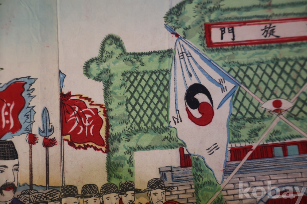 일본 목판화 원본 임니다 청일 전쟁 환영도를 가진 명치기의 극히 귀한 명화 임니다 태극기의 역사 적 기록 물 임니다 명치 27년 1894