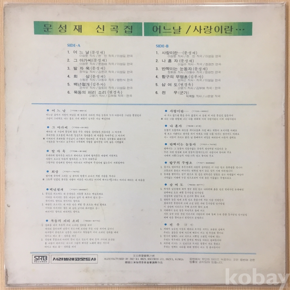 1. 어느날(문성재) 2. 그 아가씨(문성재) 3. 발자욱(문성재) 4. 회상(문성재) 5. 백년절개(김부자) 6. 목동의 피리소리(권경옥) | 1. 사랑이란...(문성재) 2. 나혼자(문성재) 3. 반짝이는 눈동자(문성재) 4. 항구의 무명초(김부자) 5. 삼여도(권경옥) 6. 전우(군가) |