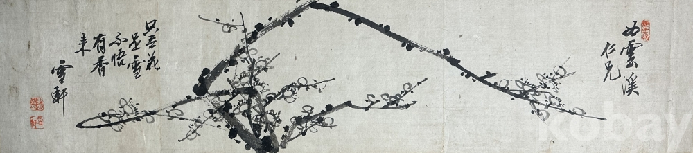 화면 전체를 가로지르는 역동적인 매화 가지와 먹의 농담을 살린 꽃송이 표현이 일품인 수묵화입니다. 작품 왼쪽에는 매화의 절개를 찬미하는 시구가 초서체로 유려하게 적혀 있으며, 그 아래에는 '설헌'이라는 호와 함께 두 개의 낙관이 선명하게 찍혀 있습니다. 세월의 흔적이 자연스럽게 묻어나는 고전적인 미감이 돋보이는 작품입니다.