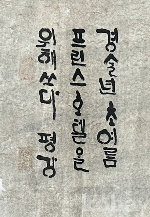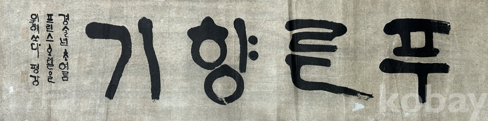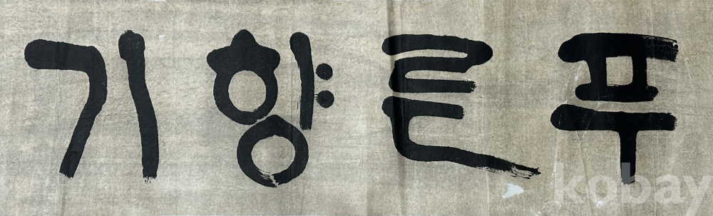 종이에 먹으로 힘 있게 쓴 한글 서예 작품으로, 굵고 단순한 획을 중심으로 한 글자 구성에서 강한 필압과 리듬감이 느껴집니다. 여백을 넓게 살린 가로형 화면 위에 검은 먹의 농담과 번짐이 대비를 이루며, 문자 자체의 조형성과 에너지를 강조한 표현이 특징입니다. 전통 서예의 필법을 바탕으로 하면서도 현대적인 감각이 드러나는 한글 서예 작품으로, 시각적인 존재감이 분명한 화면을 보여줍니다.