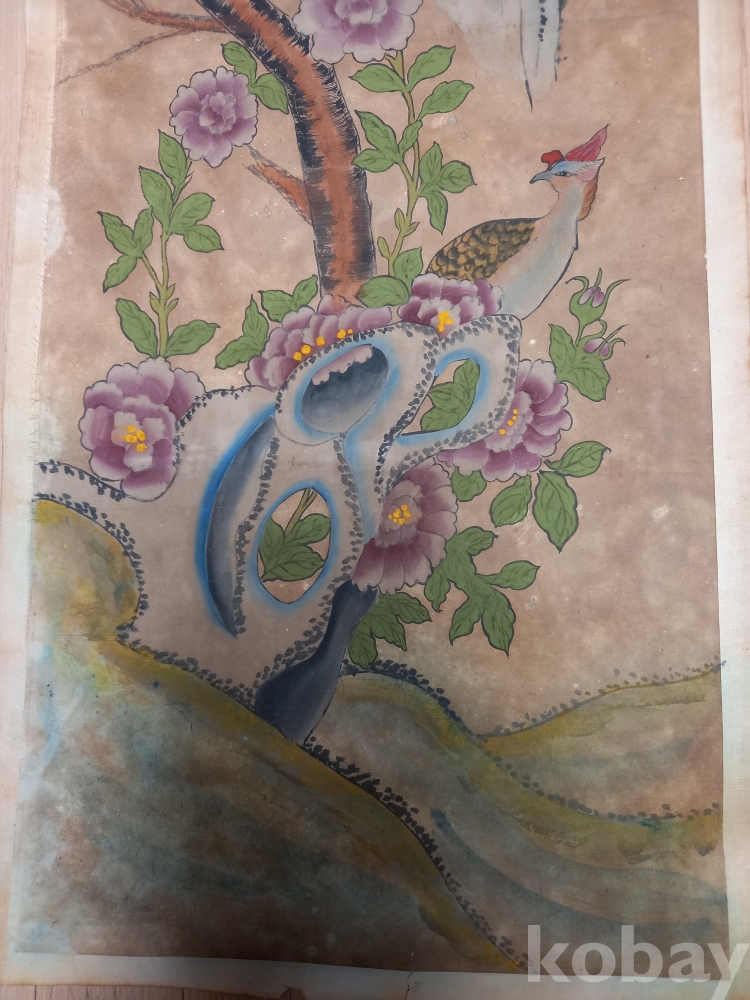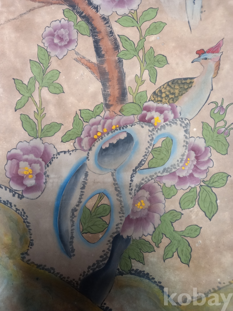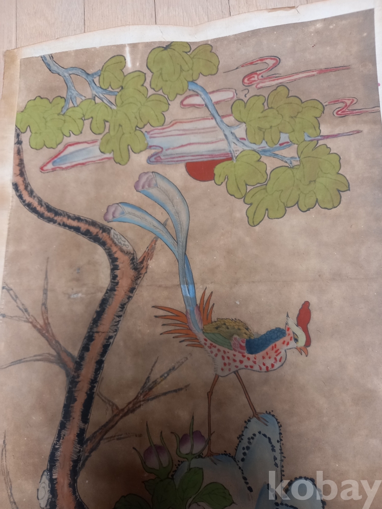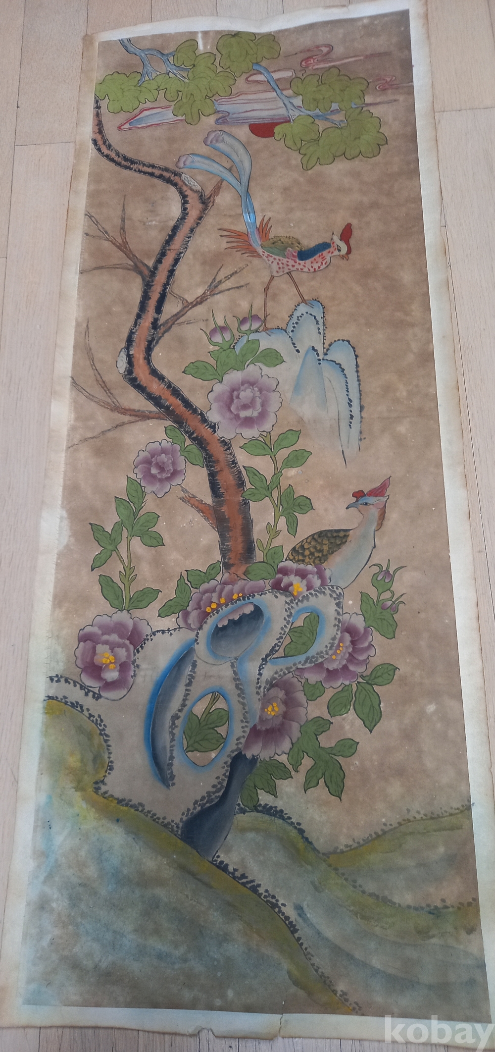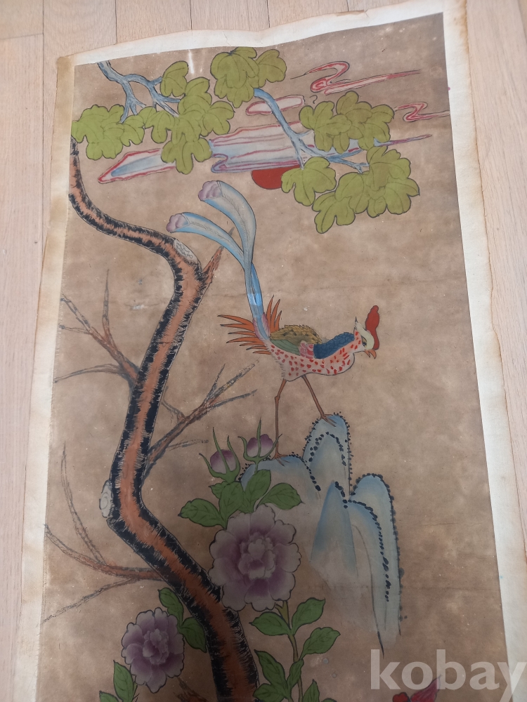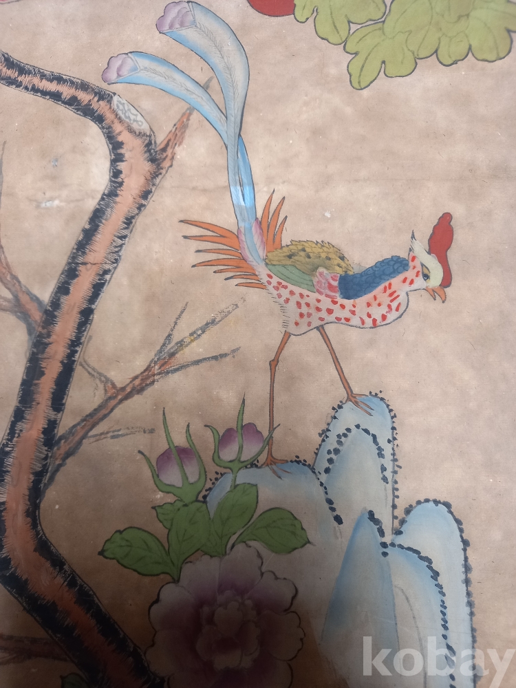 상태 a급 오래된 고화 민화 봉황도 연대는 한말이나 일제초쯤으로 원래 봉황도를 좋은민화로 보는것은 해와 해주변 구름을멋있게표현 함 때문입니다 괴석모란뒤에서 숫컷을 부르는 표현일것입니다 공백 별로 없이 꽉찬 민화입니다