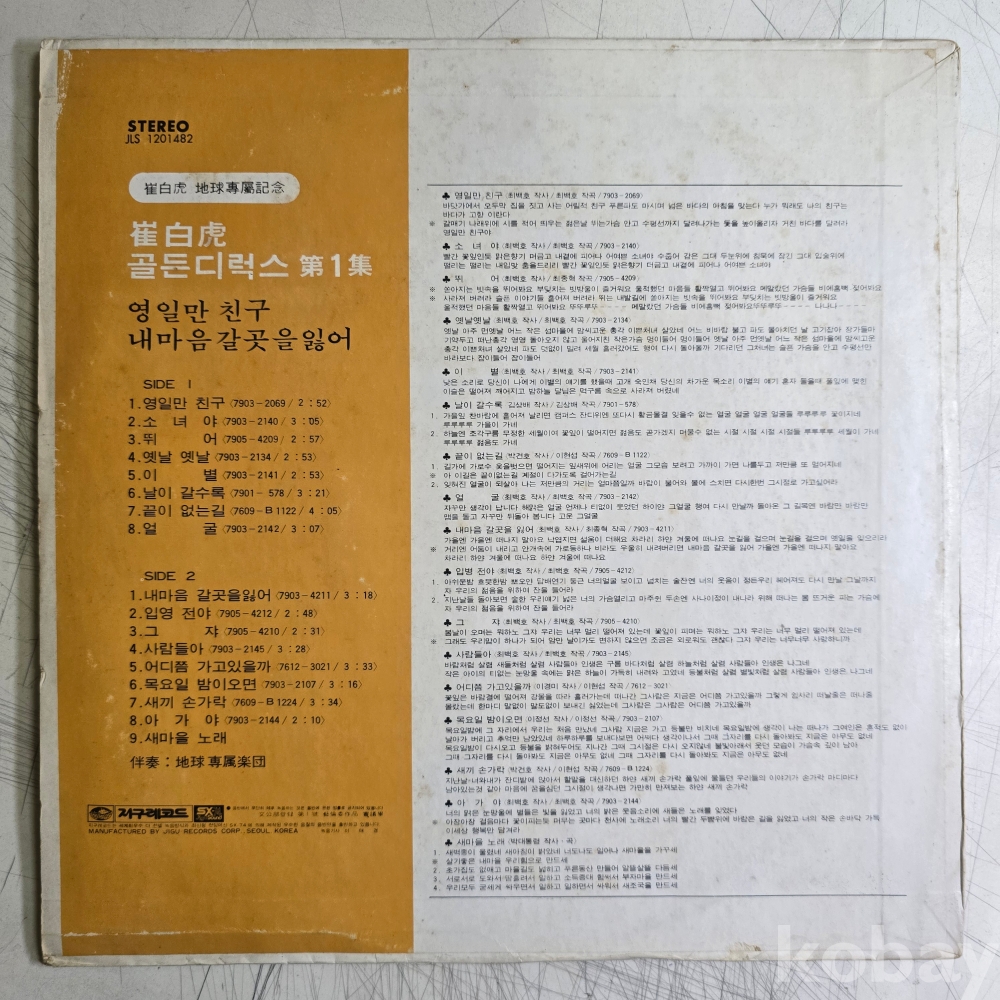 | 자켓상태 | VG : 주름, 접힘, 모서리 찢김 다수 | 음반상태 | VG : 생활 기스 다수, 가벼운 노이즈 존재 | 발매정보 | 초반 | 가사지여부 | 무 |