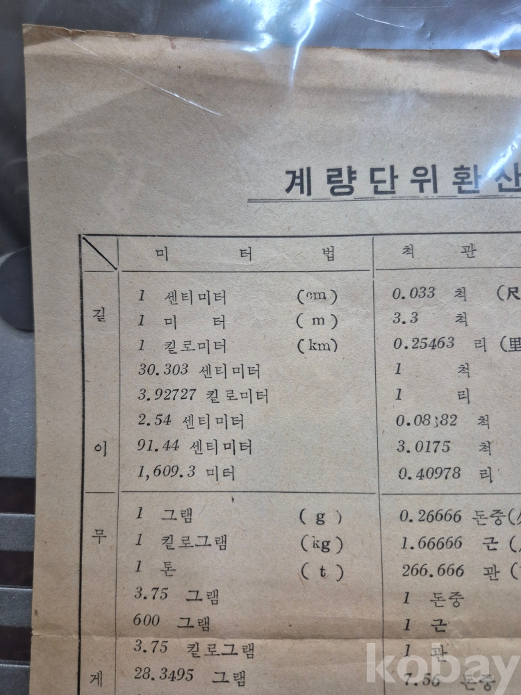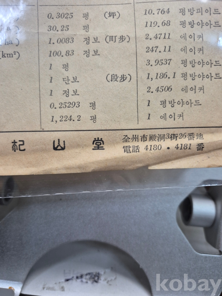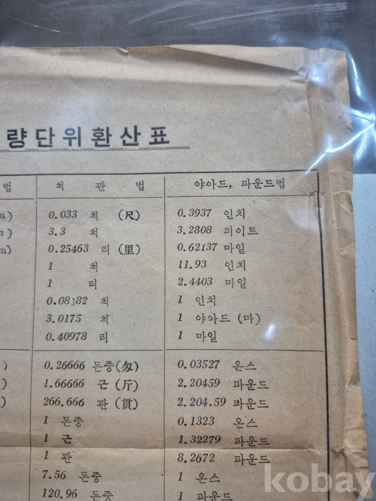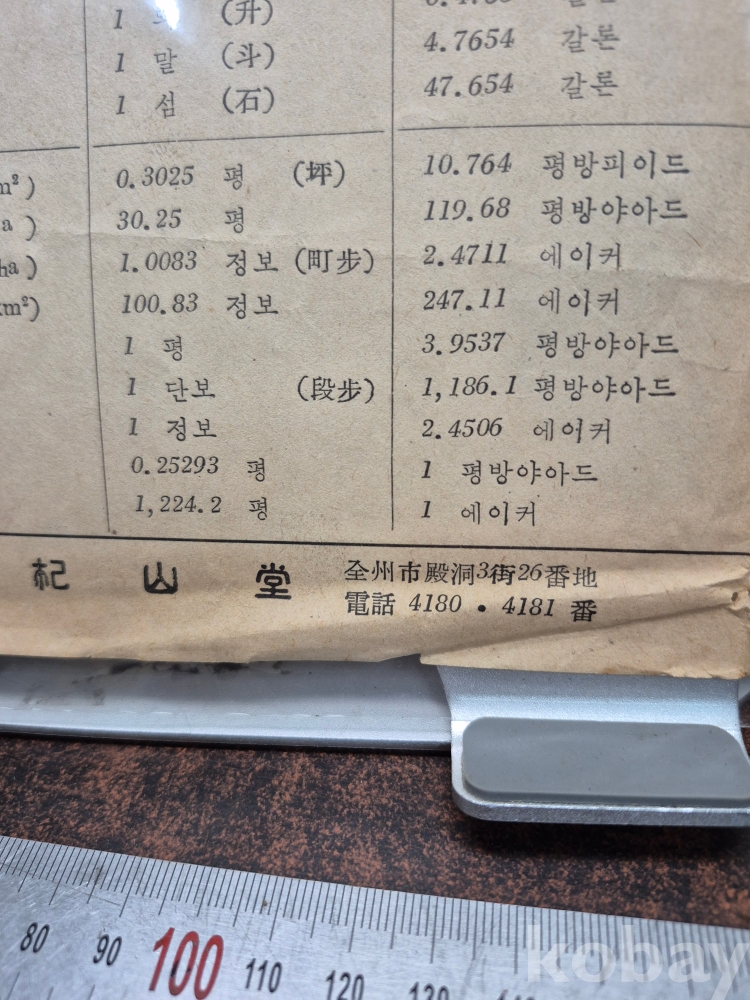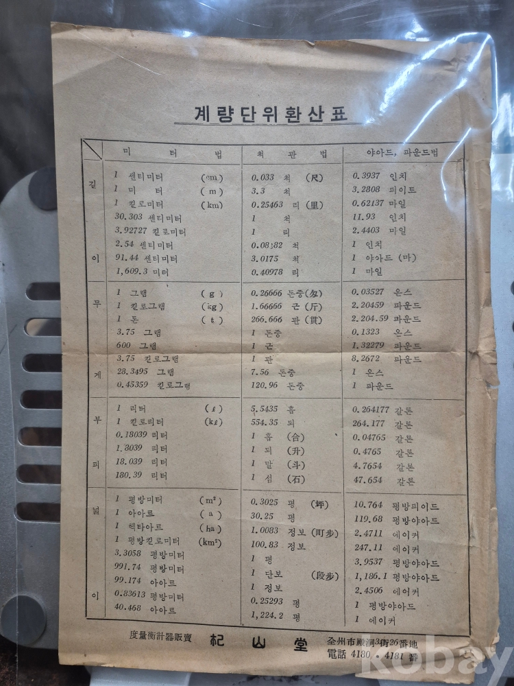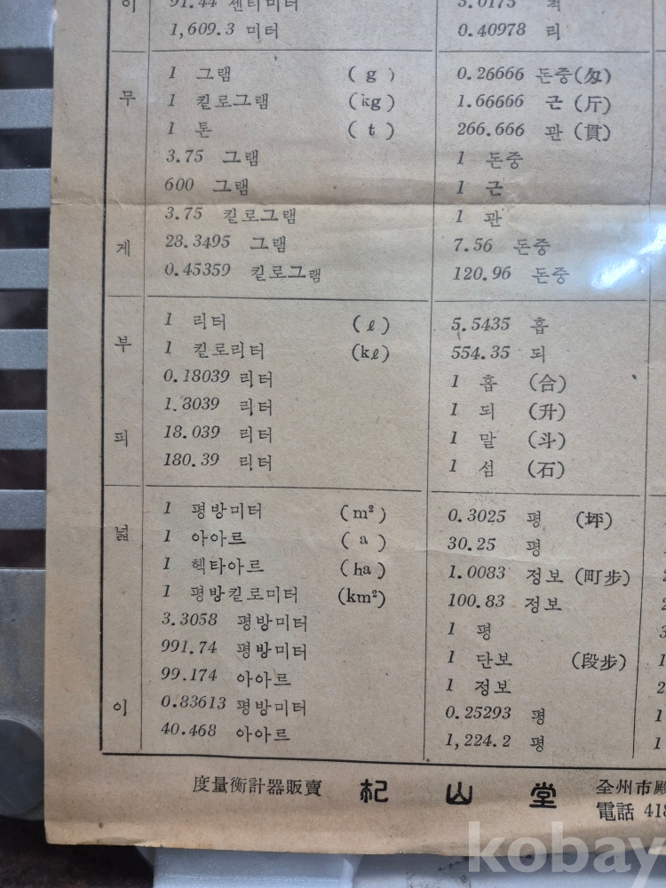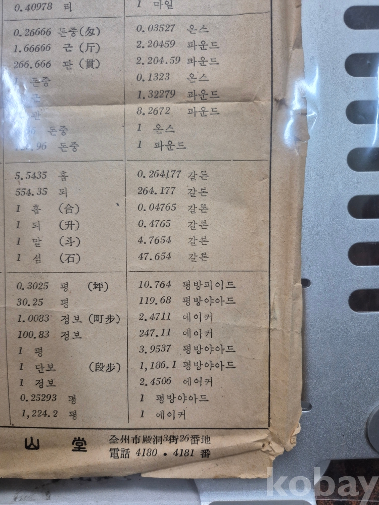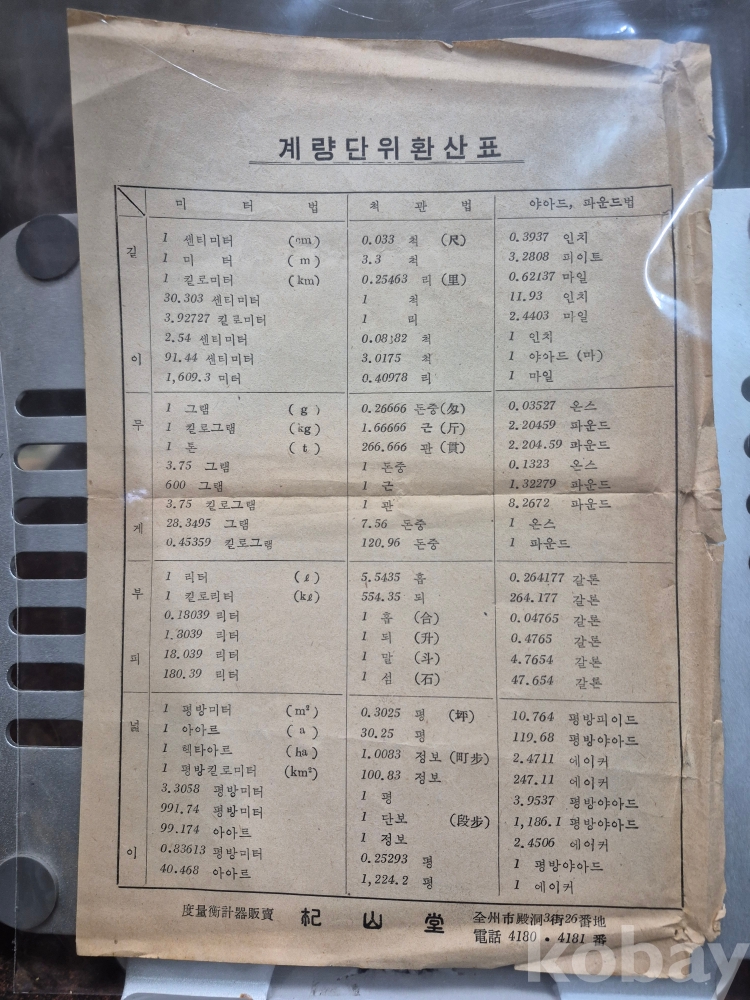 1960년대 전주시 전동 3가 26번지 사선당 도량형 계측기 판매 업체에서 지급하는 계량단위 환산표 18*26