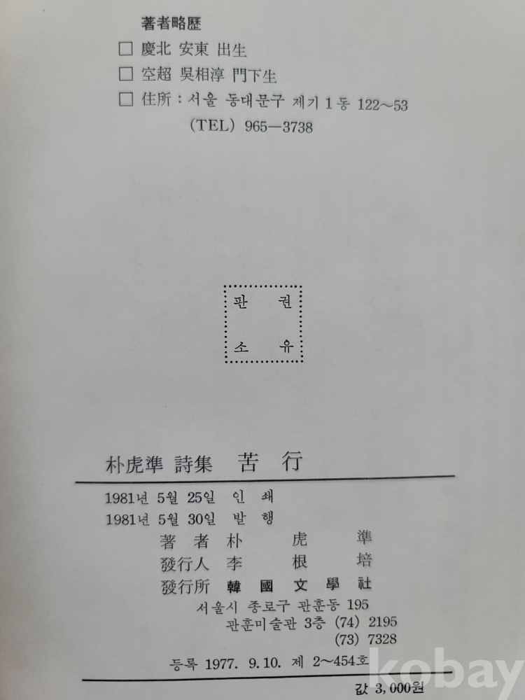 양장본(Hard Cover). 韓國文學社에서 발행한 첫 시집.