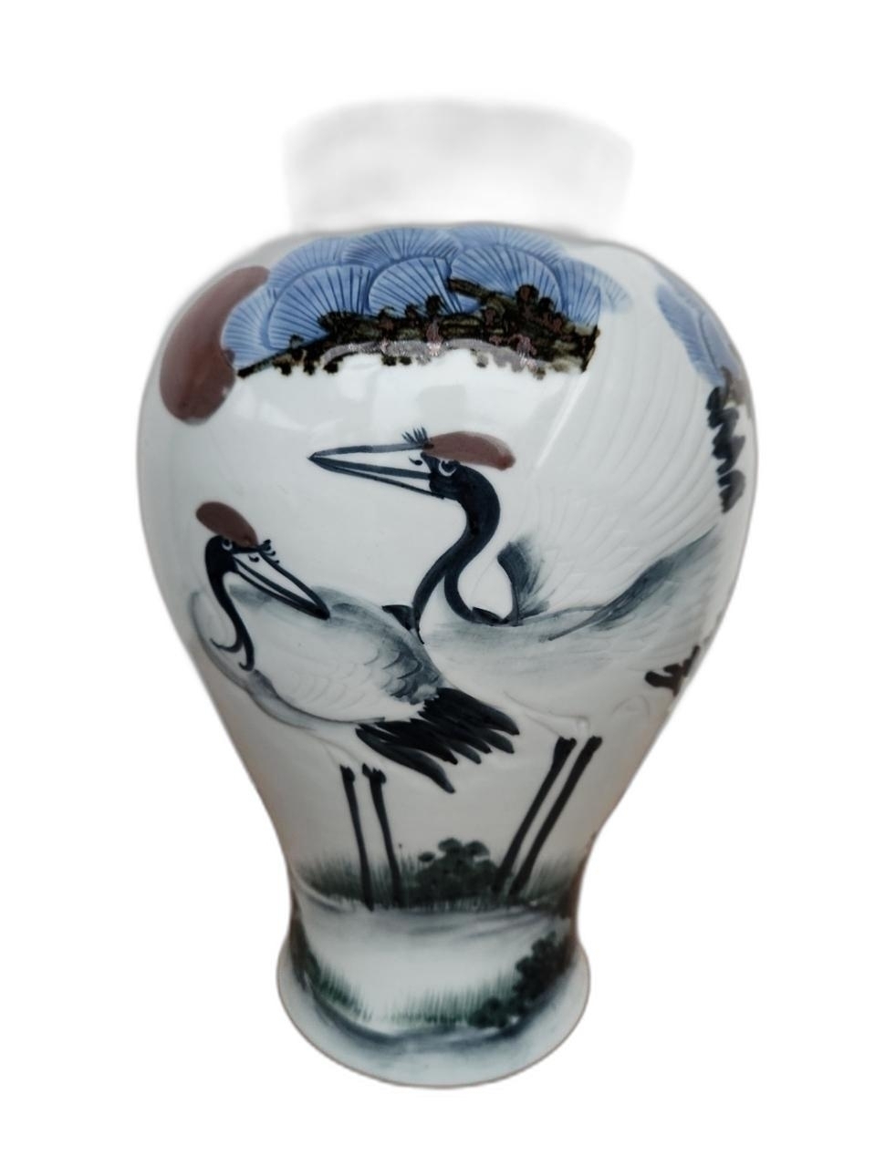 소나무 아래 학을 아름답게 표현한 도자기 입니다.