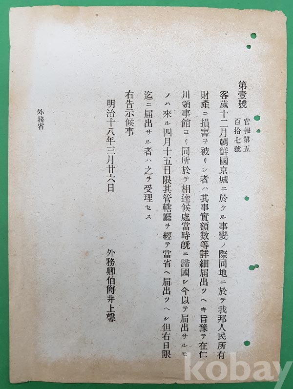 갑신정변후 朝鮮에 온 일본 이노우에 가오루(井上聲) 명의로 발행된 것으로서