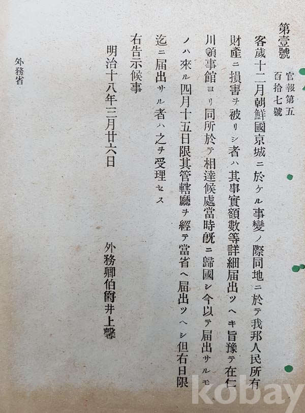 明治18년 (1885년) 官報 제517호에 실린 日本 外務省 告示 제1호