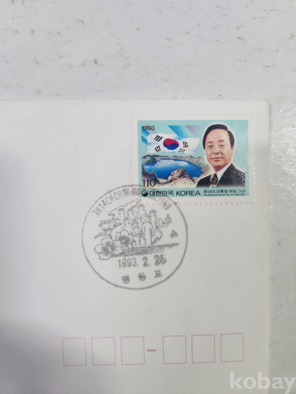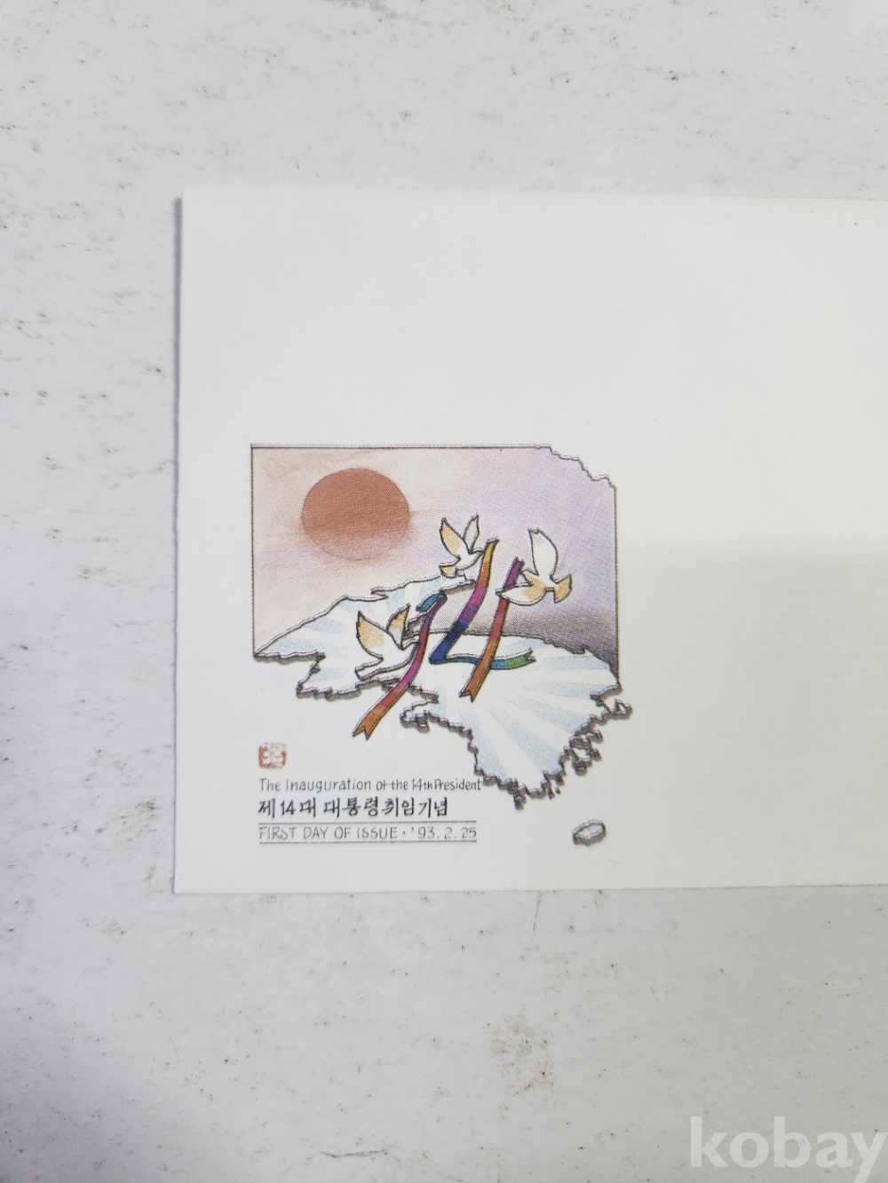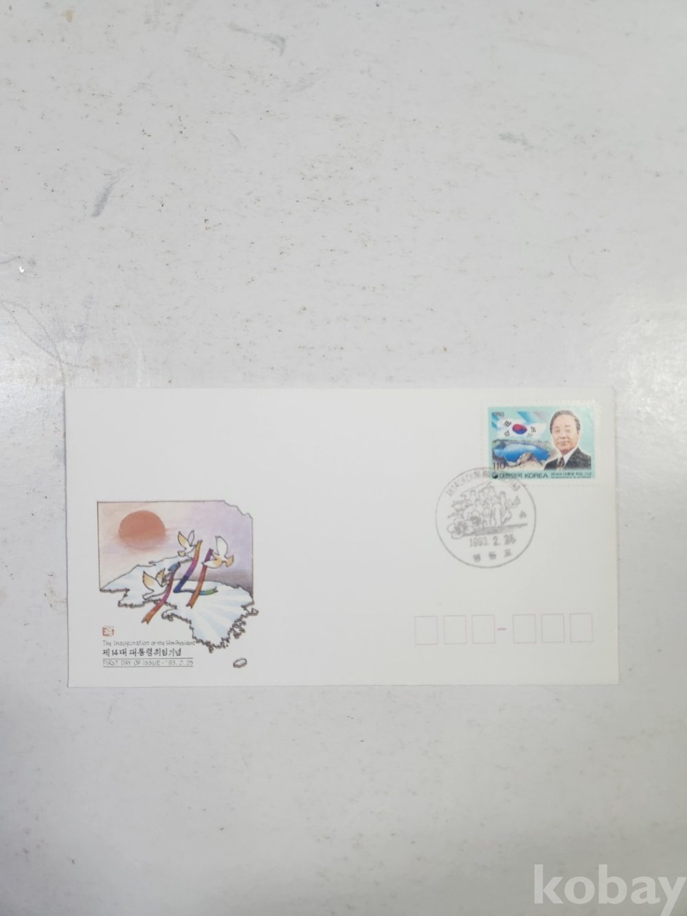 제14대 김영삼대통령 취임 기념 우표와 우표가 붙어있는 봉투입니다.