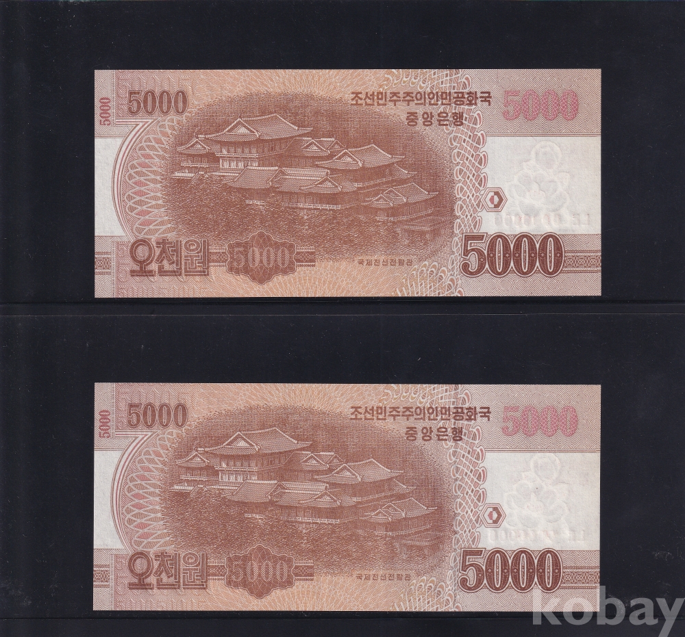 - 윗동네 2017년 김정숙동지 탄생 100돐 오천원 000 견양권 미사용 지폐 - 2장 일괄