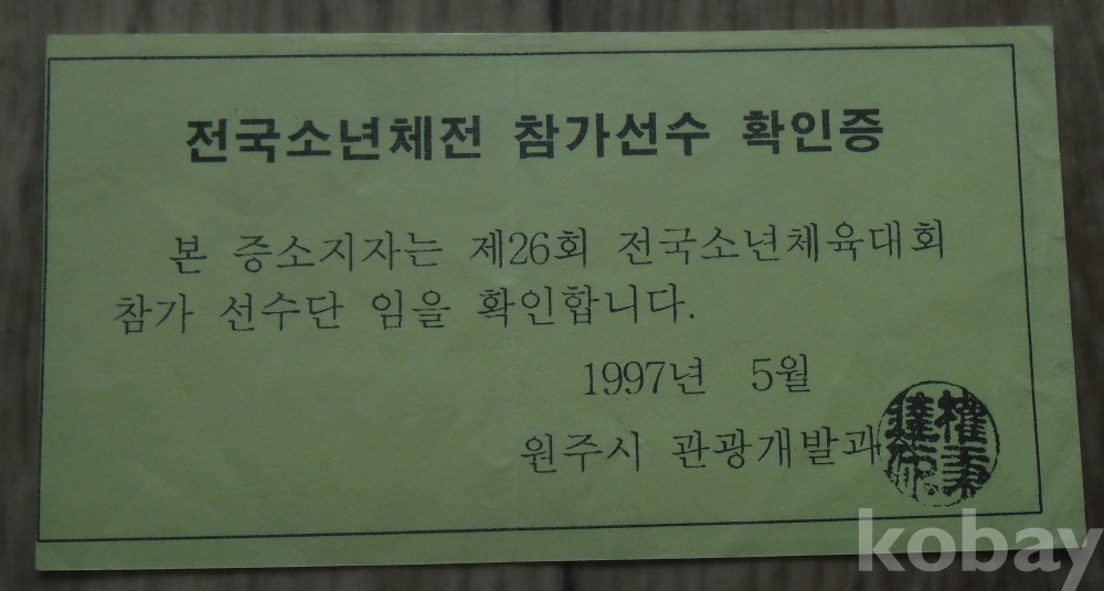 1997년 전국소년체전 참가선수 확인증(원주시)