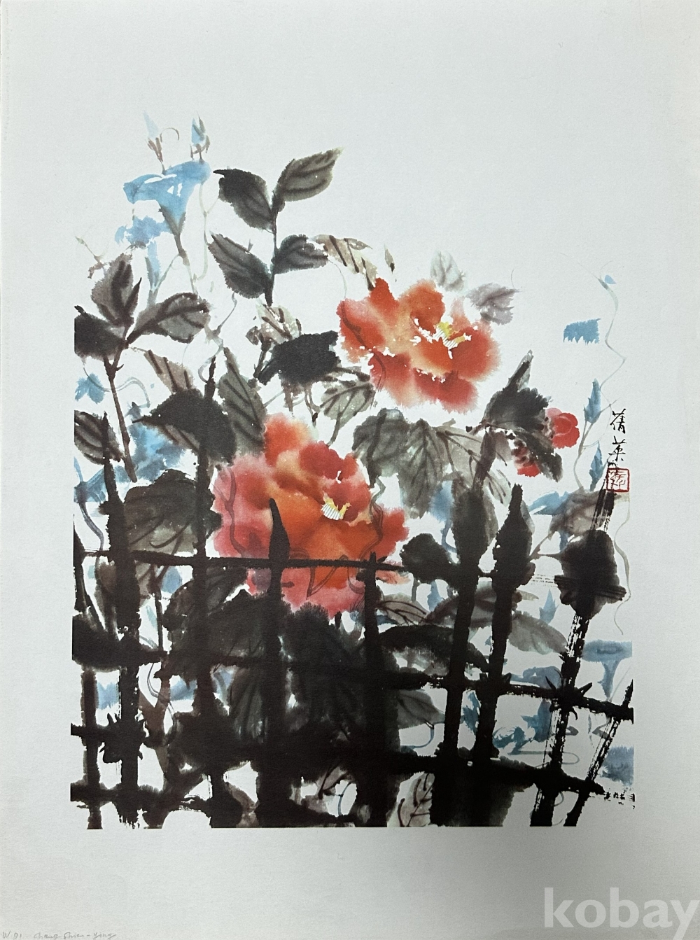 중국 출신의 세계적인 화가 치엔 잉 창(Chien-Ying Chang)의 작품을 담은 고품질 인쇄본입니다. 작가는 영국 런던에서 활동하며 동양화의 서정성을 서구 미술계에 알린 선구적인 예술가입니다. 본 작품은 울타리 너머로 피어난 꽃들을 맑은 수묵 담채 기법으로 표현한 원화를 바탕으로 제작되었습니다. 왼쪽 하단에 작가의 영문 이름이 기재되어 있으며, 우측 상단의 낙관까지 정교하게 인쇄되어 있어 인테리어용 및 감상용으로 훌륭합니다.