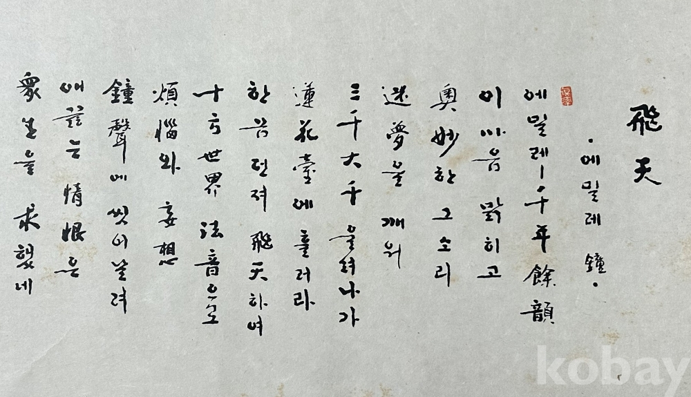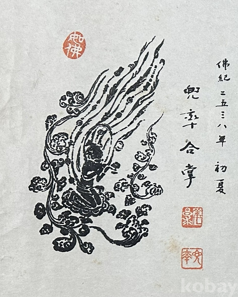 종이에 먹으로 그린 불교 설화 주제의 서화 작품으로, 화면 좌측에는 불교적 상징성을 지닌 인물을 묘사한 삽화가 배치되고, 우측에는 세로로 구성된 한글 서체의 글귀가 조화를 이루고 있습니다. 굵기와 속도감이 살아 있는 필선과 자유로운 필획이 어우러져 신앙적 메시지와 서사적 분위기를 함께 전달하며, 그림과 글이 하나의 화면 안에서 균형감 있게 구성된 점이 특징입니다. 전체적으로 담담하면서도 기운이 살아 있는 표현을 통해 전통 불교 회화 및 서예의 감상을 동시에 느낄 수 있는 작품입니다.