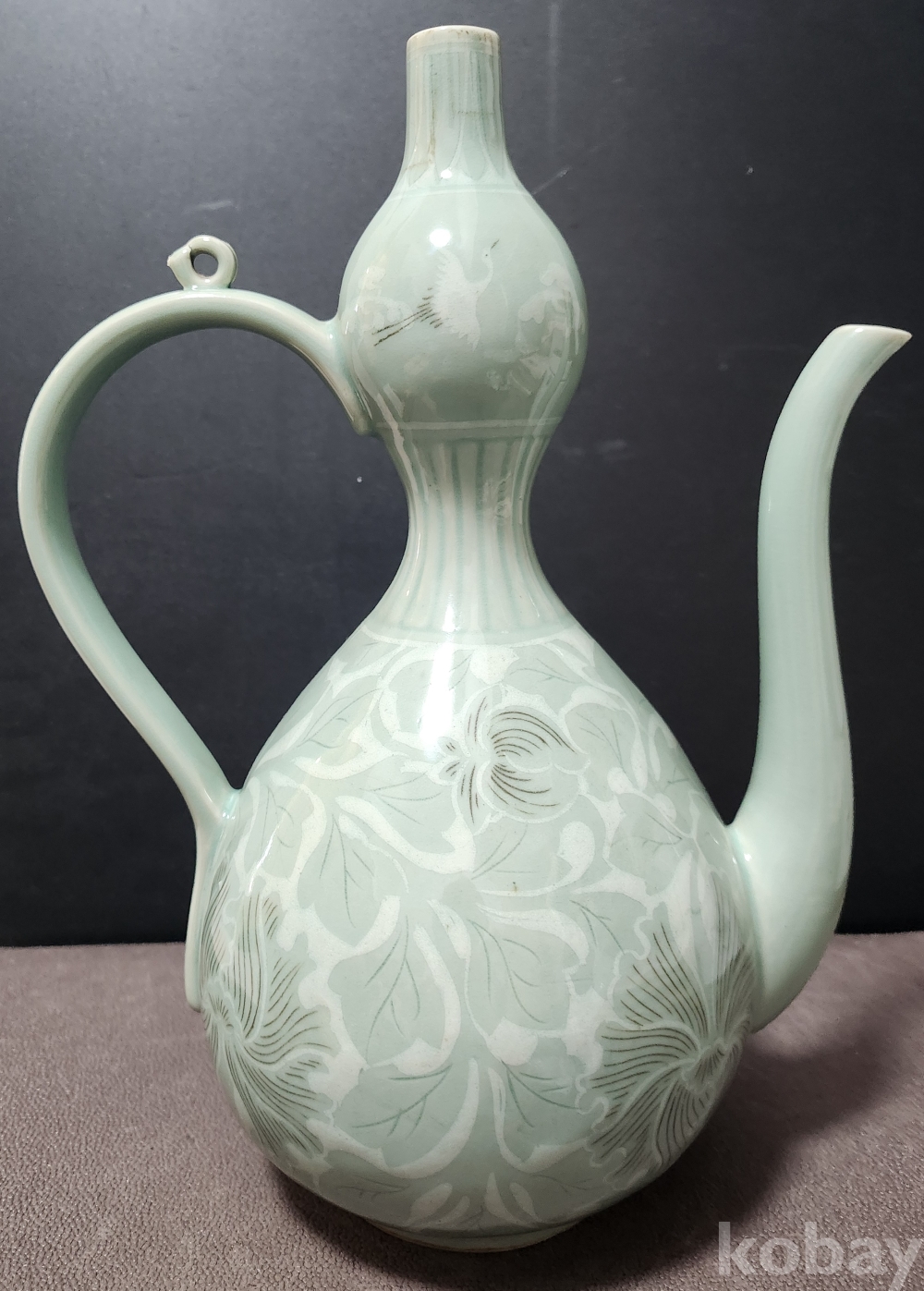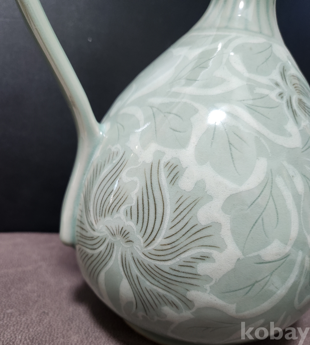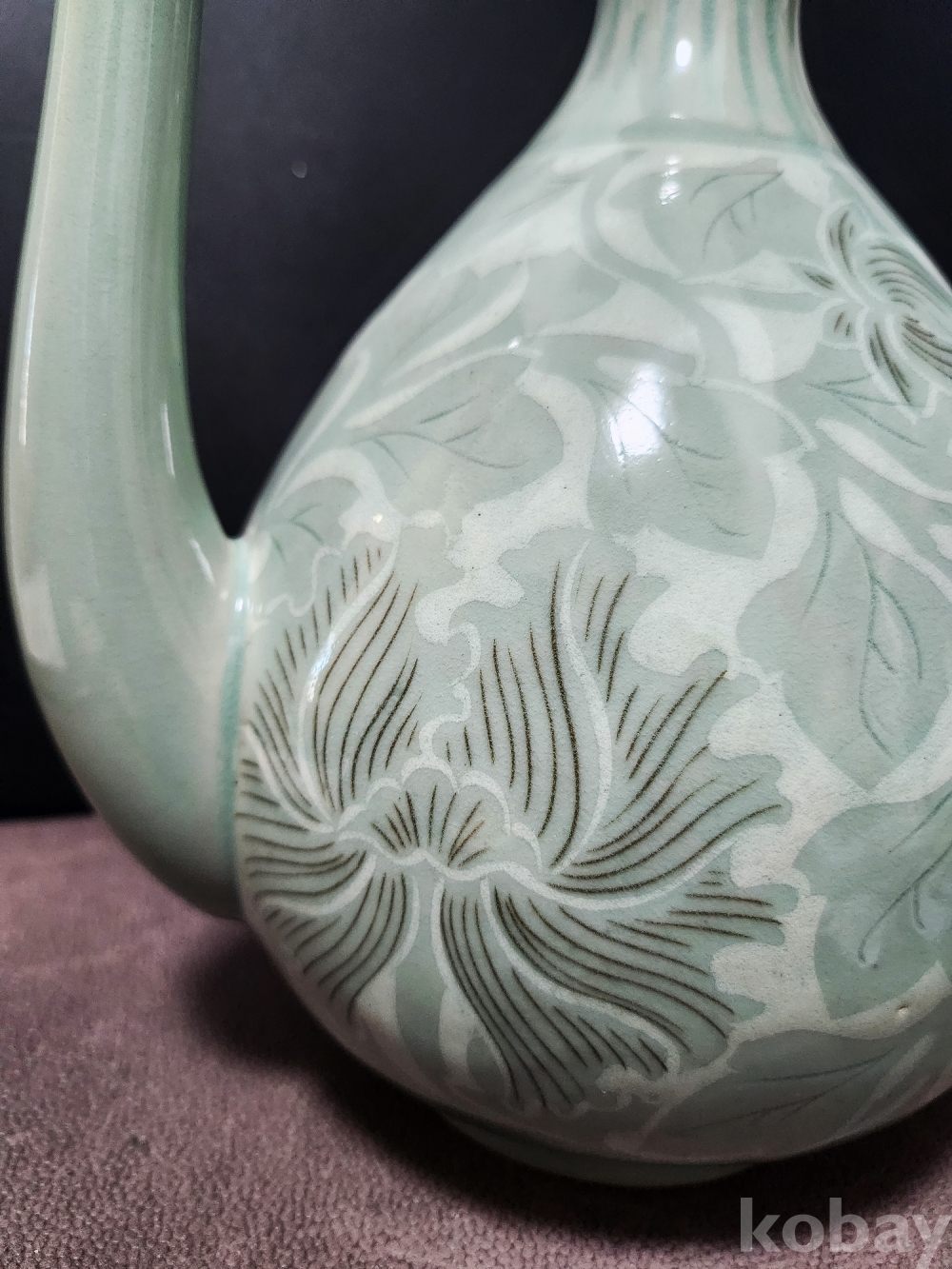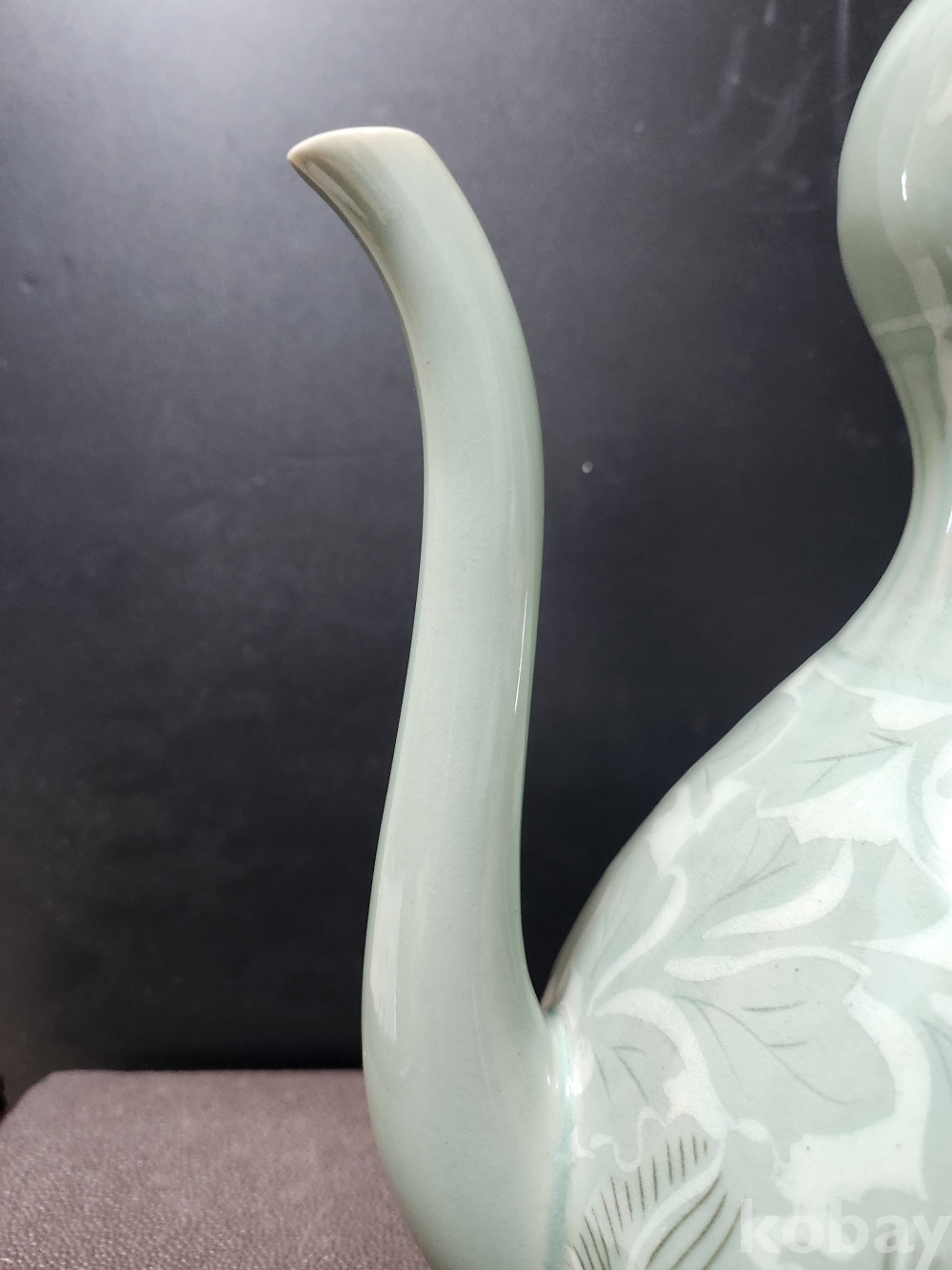 < 도예명장 作 > 석봉 조무호 石峰 趙懋鎬 청자음각운학화훼문주자 靑瓷陰刻雲鶴花卉紋注子