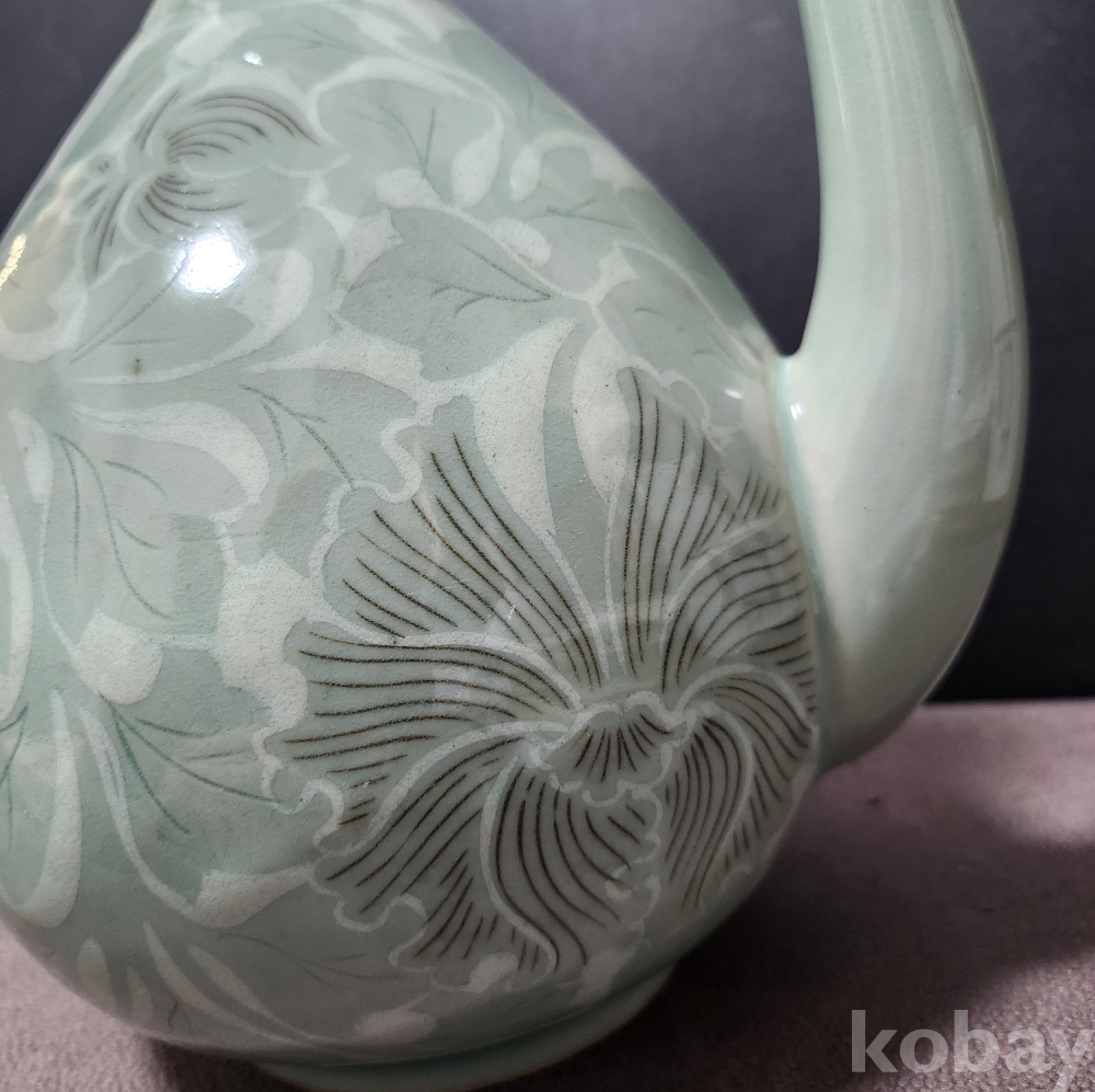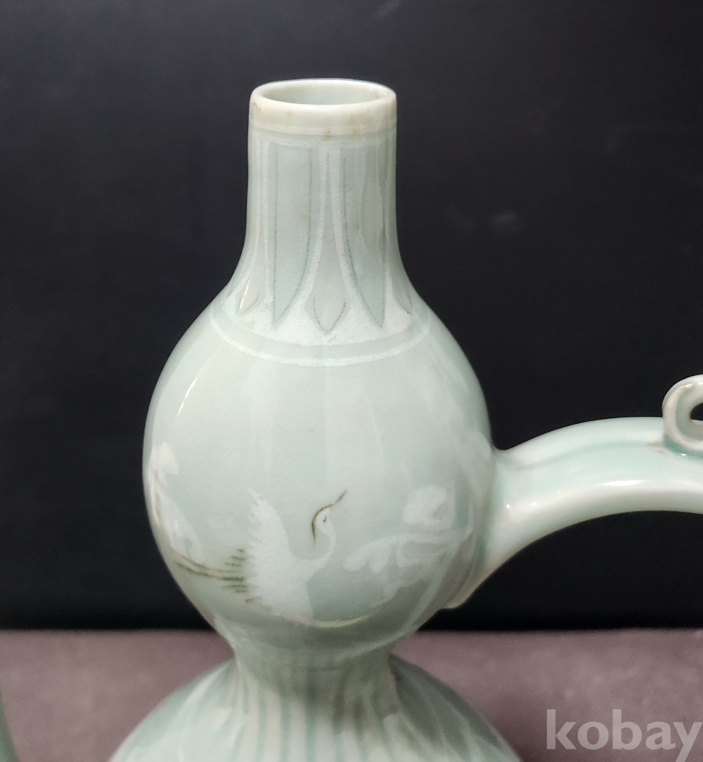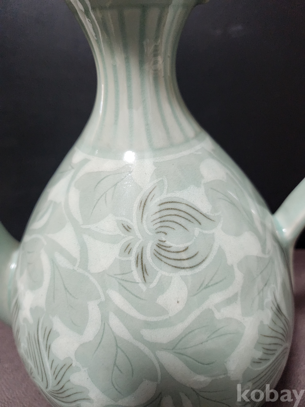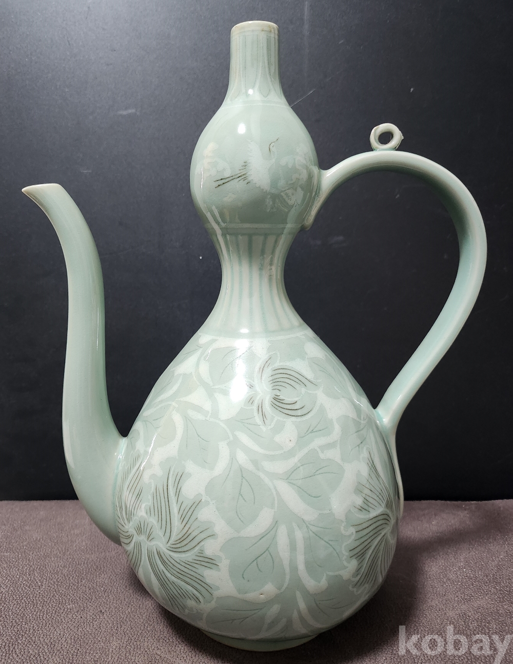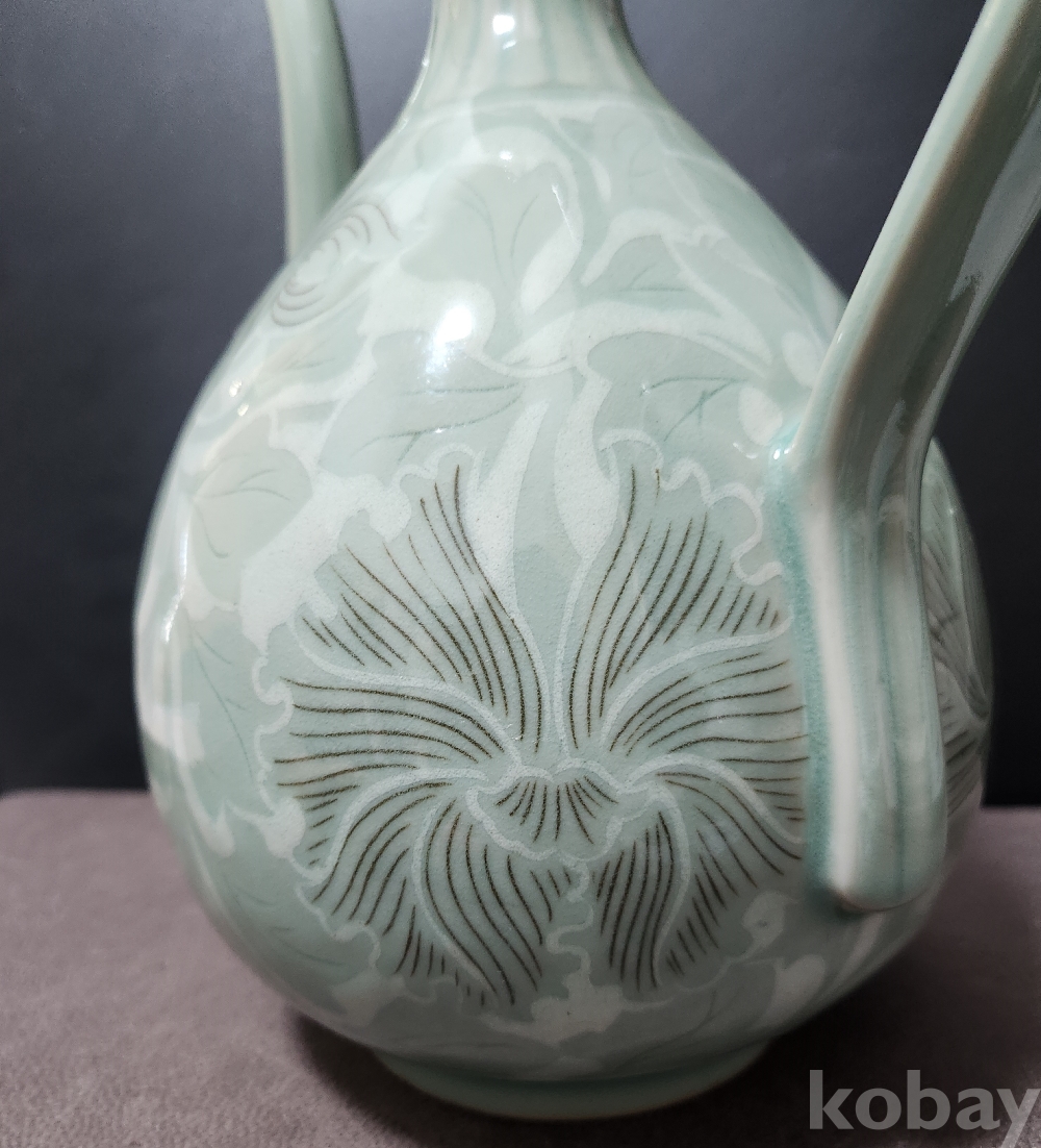 < 도예명장 作 > 석봉 조무호 石峰 趙懋鎬 청자음각운학화훼문주자 靑瓷陰刻雲鶴花卉紋注子