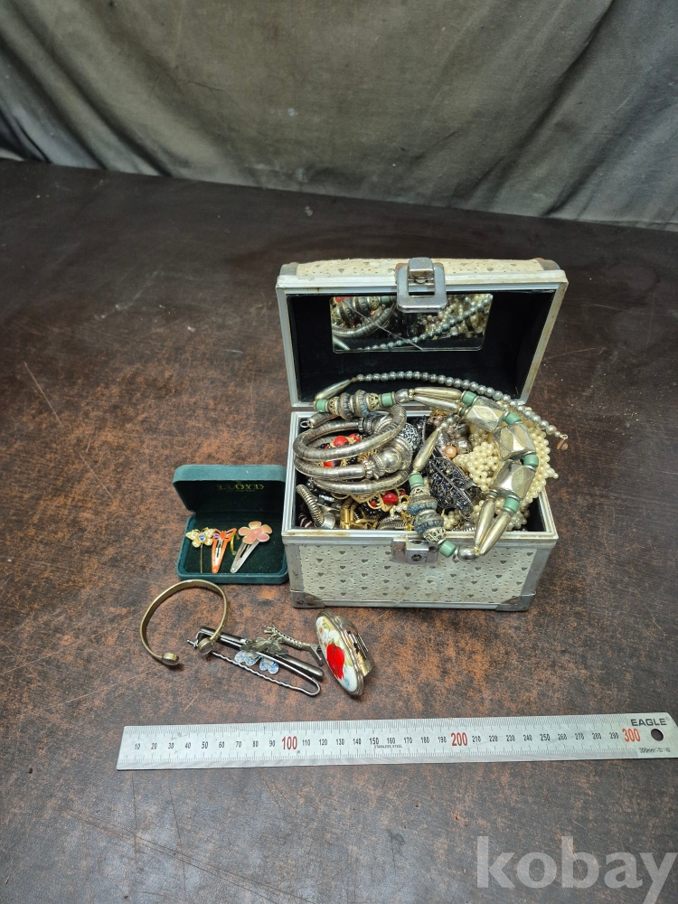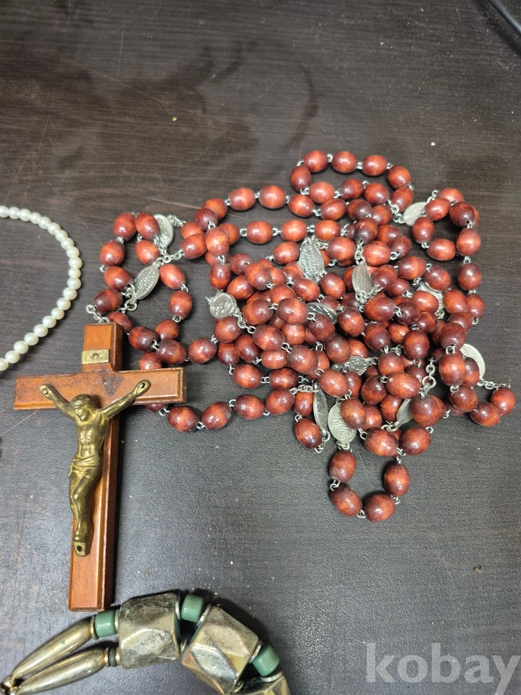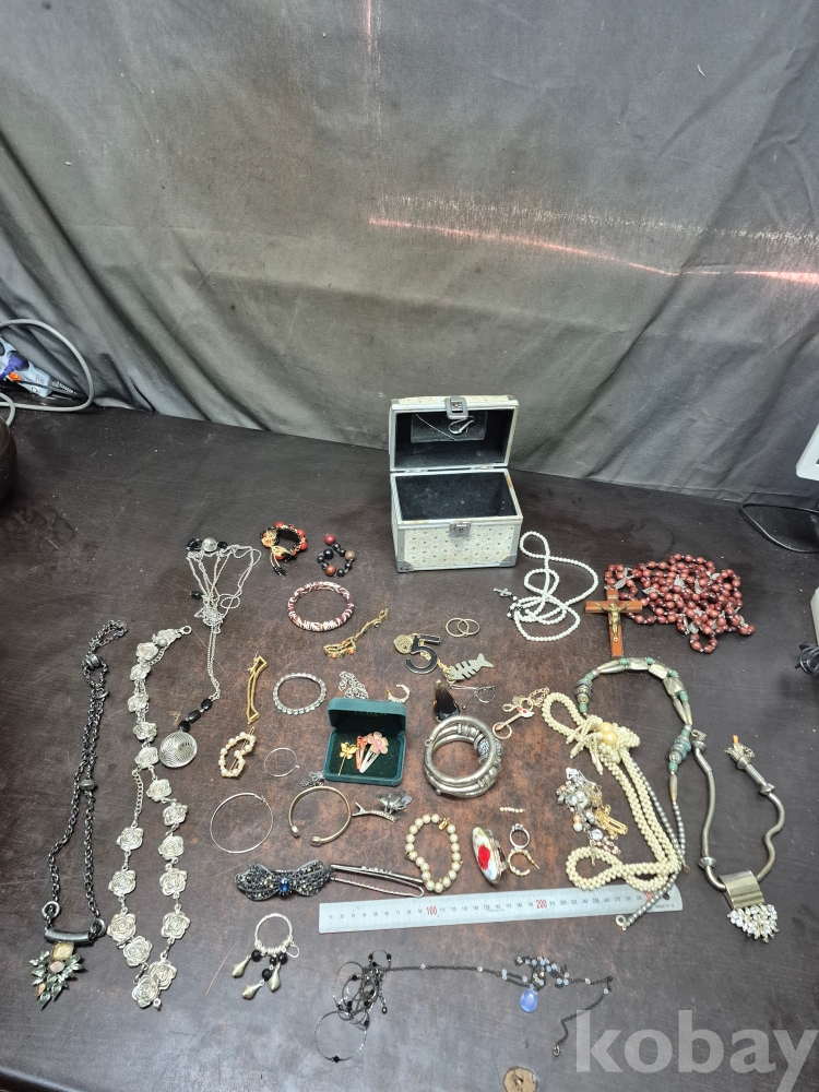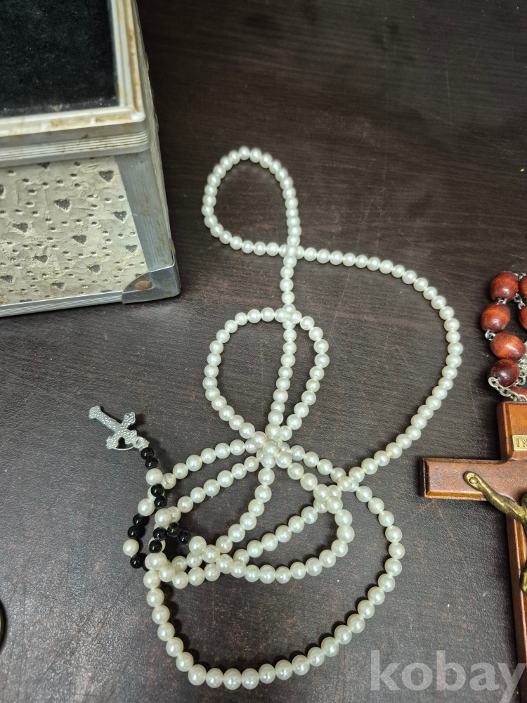 1980년대 각종 보석 이미테이션 목걸이 귀걸이 반지 등 수량 다수 와 에수님 묵주 포함 보관케이스 포함 16*11*15