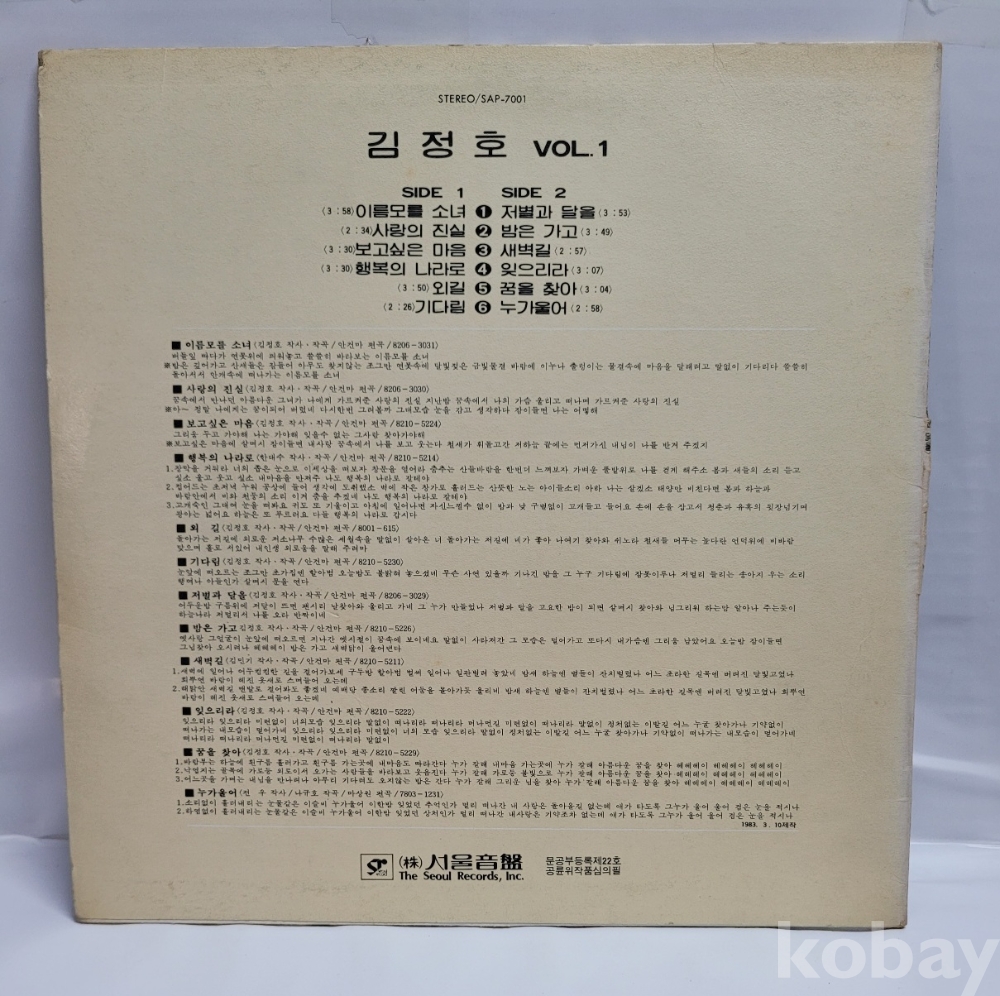 | 자켓상태 | VG : 주름, 접힘, 모서리 찢김 다수 | 음반상태 | VG : 생활 기스 다수, 가벼운 노이즈 존재 | 발매정보 | 초반 | 가사지여부 | 무 |