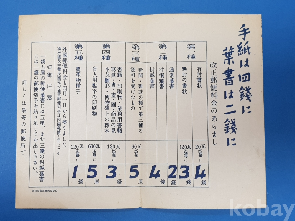 **** 일제시 체신성 발행 [개정 우편요금표]