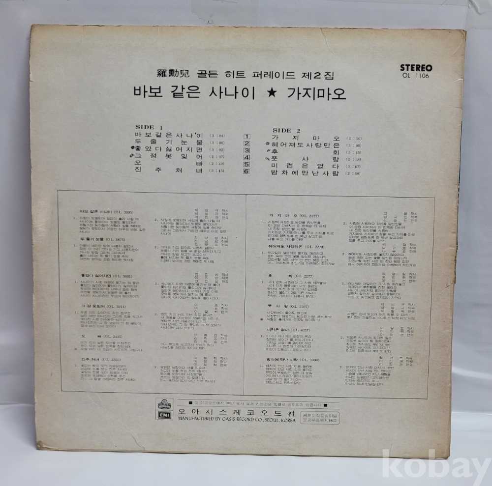 | 자켓상태 | VG : 주름, 접힘, 모서리 찢김 다수 | 음반상태 | VG : 생활 기스 다수, 가벼운 노이즈 존재 | 발매정보 | 초반 | 가사지여부 | 무 |