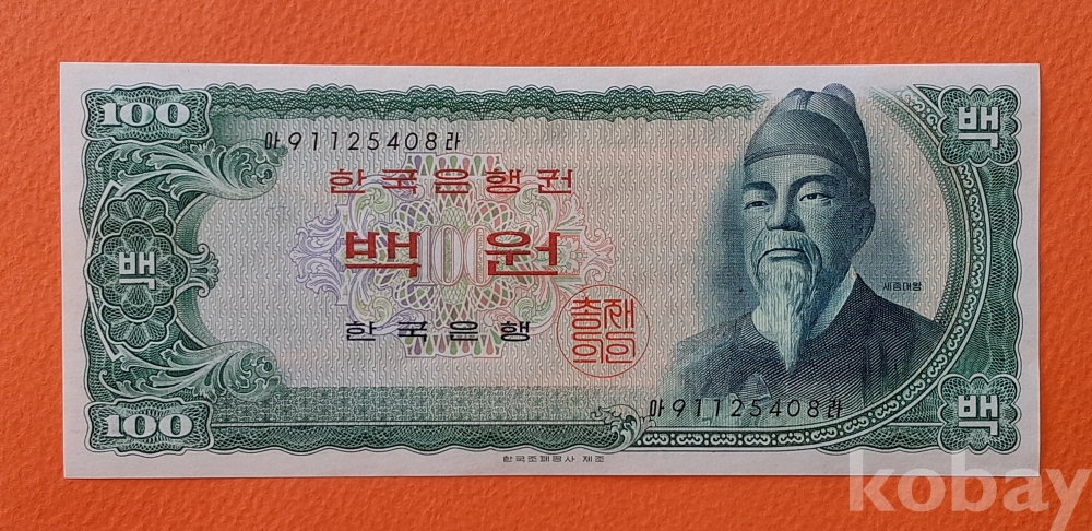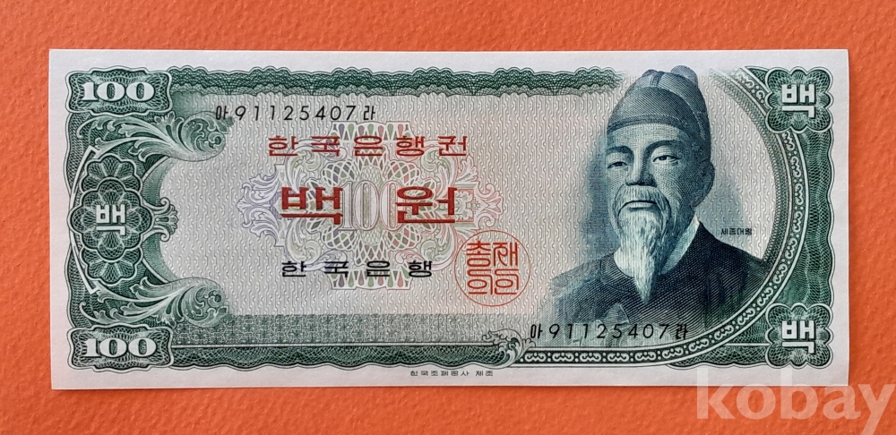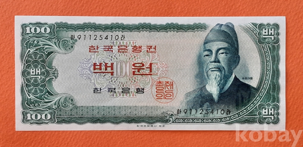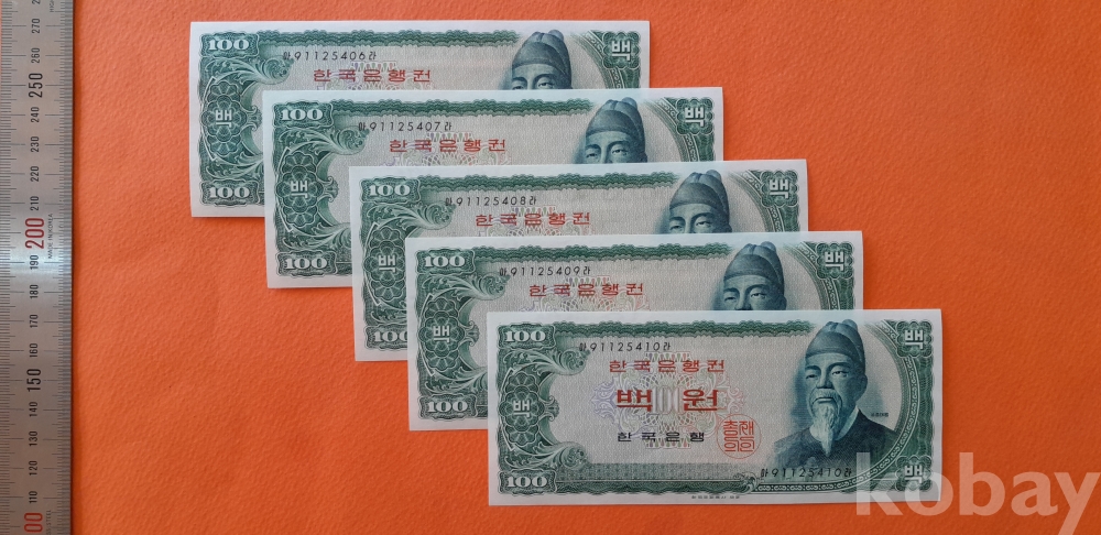 한국은행 다 100원(세종대왕) 미사용급 5연번 지폐 입니다.