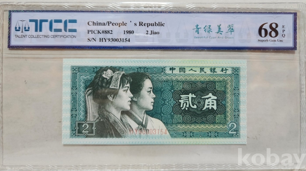 -1980년 중국 인민은행 발행 2각 지폐 TCC68 고등급 입니다.