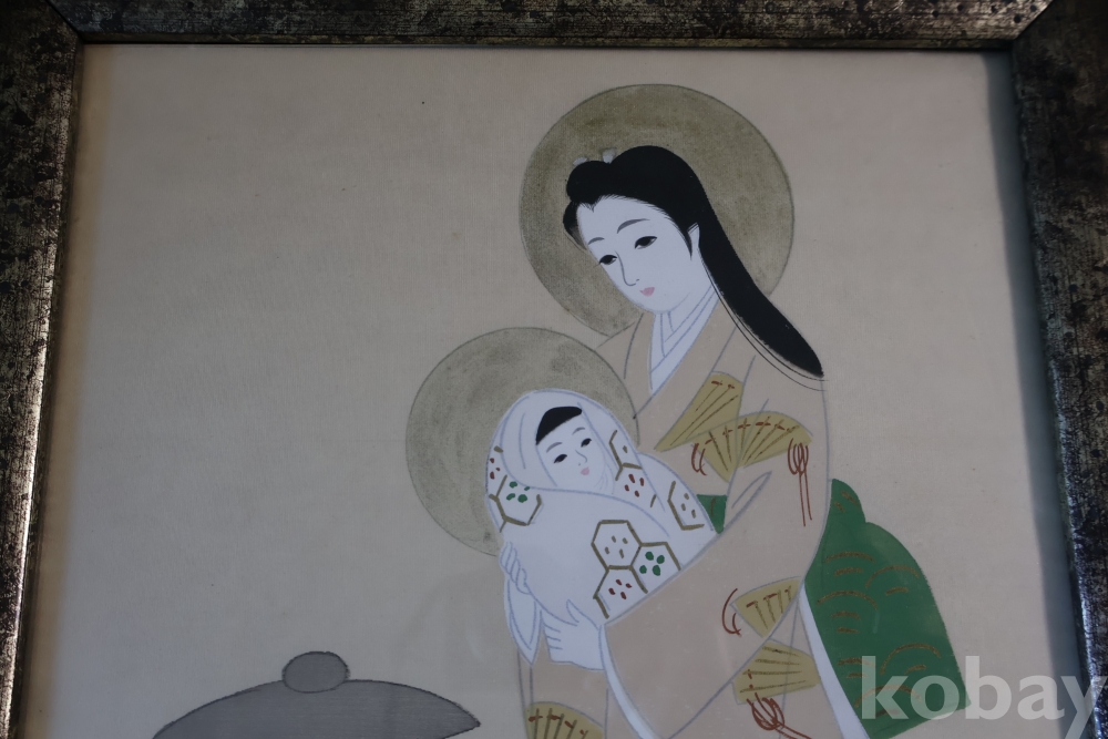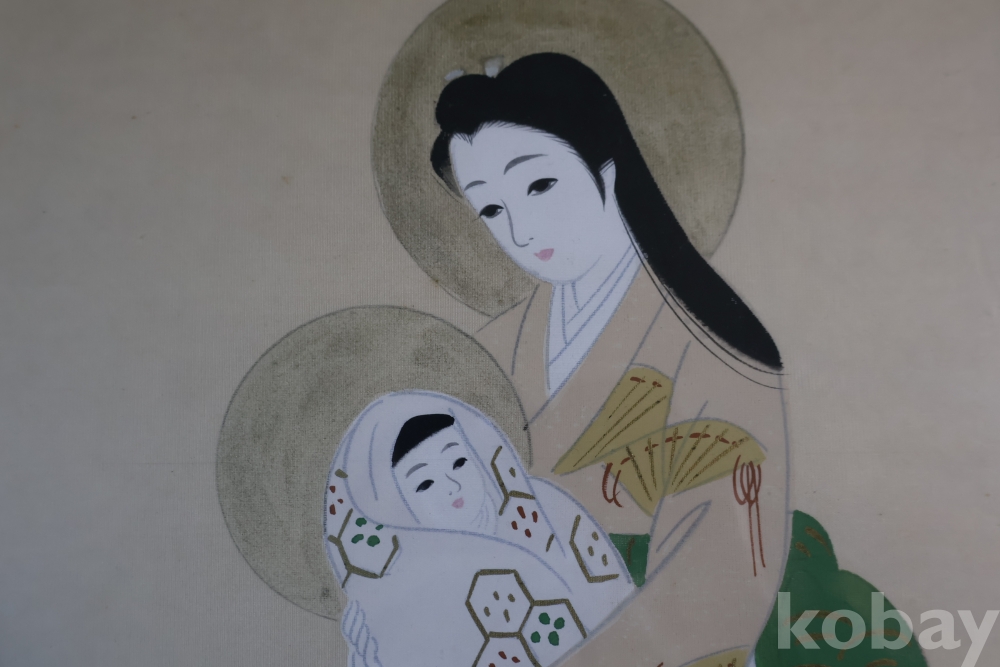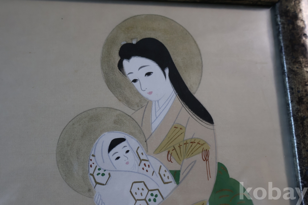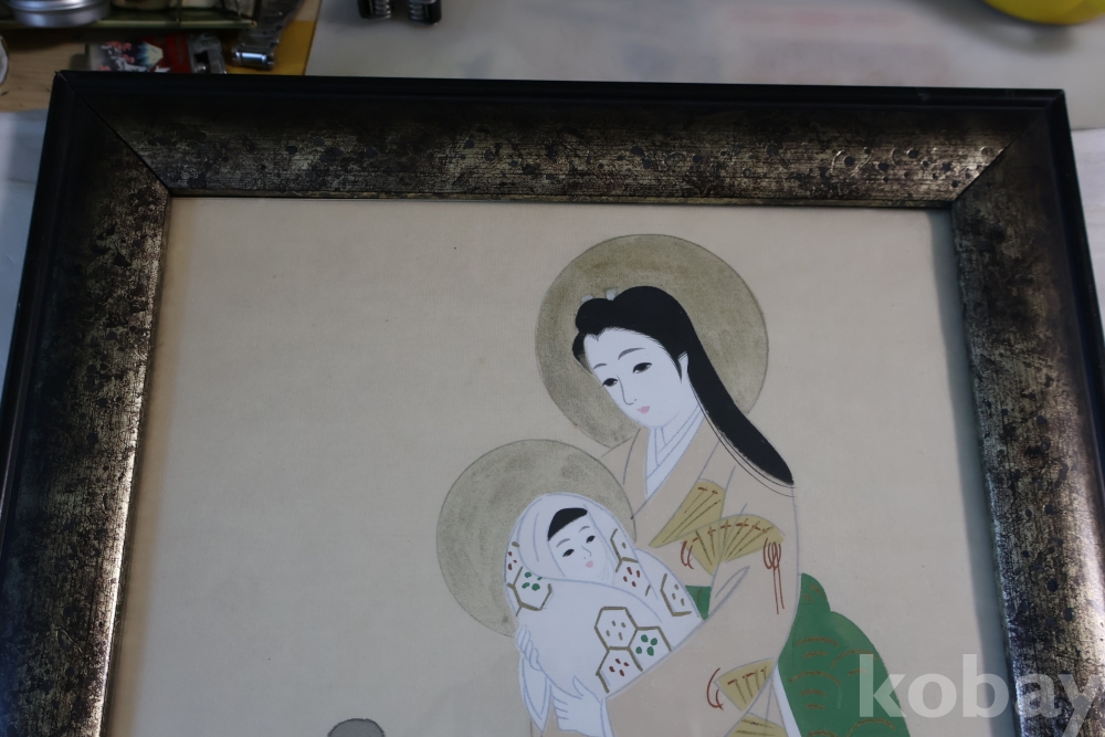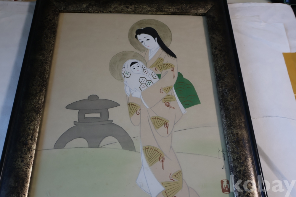 일본 성모 비단화 임니다 화가의 낙관을 가진 명화 임니다 나무 액자 역시 이태리 액자 이며 세월의 흔적을 가진 명물 임니다 사진 참조 하세요