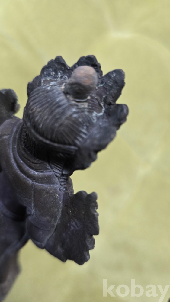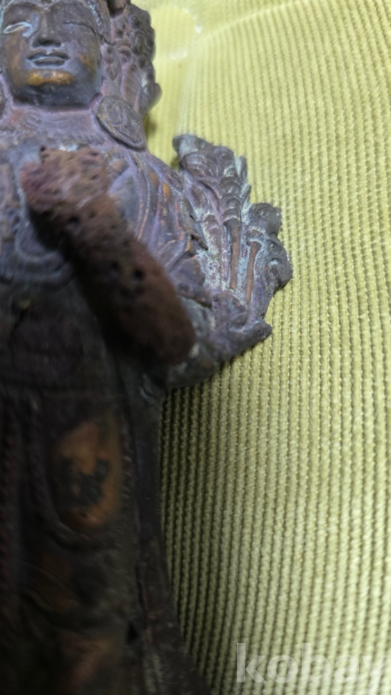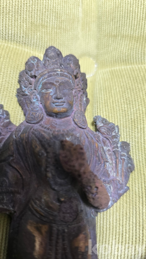 이 기물은 화려한 보관(모자)을 쓰고 있는 보살상으로 보이는데, 상태가 온전하지 않아 오히려 더 눈길이 갑니다.