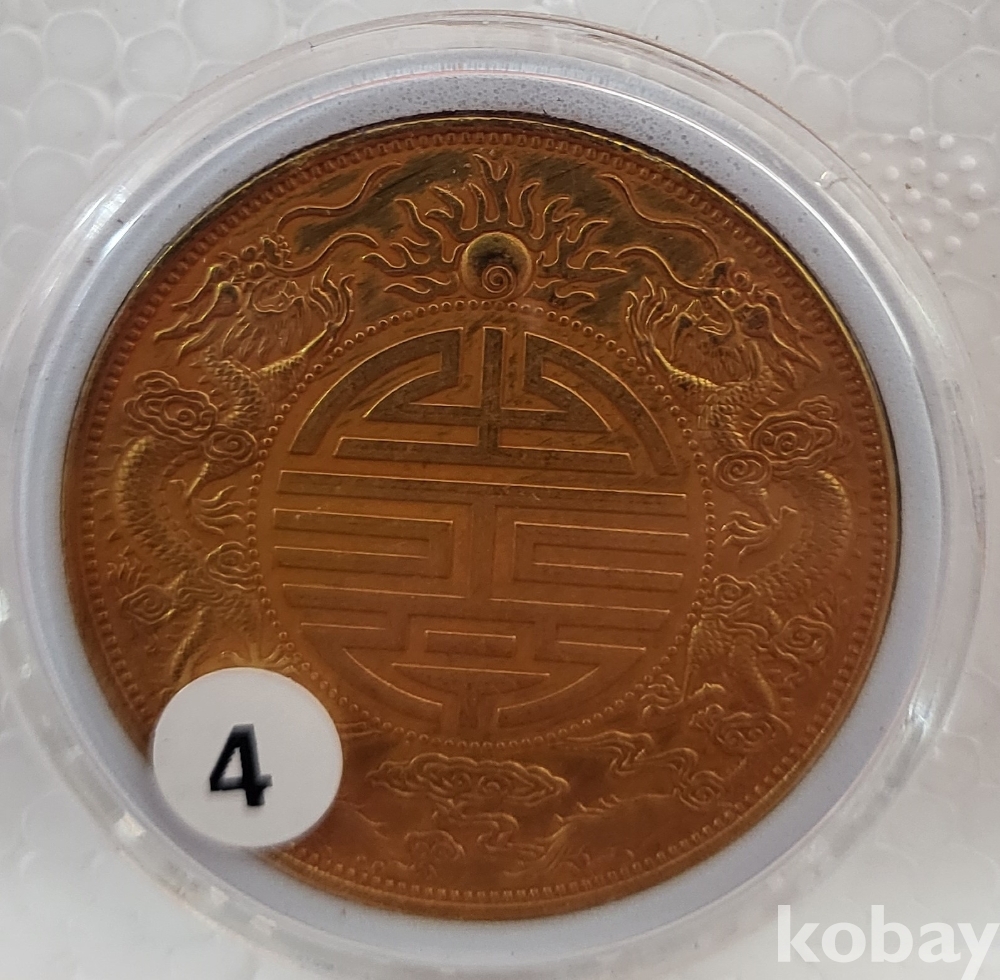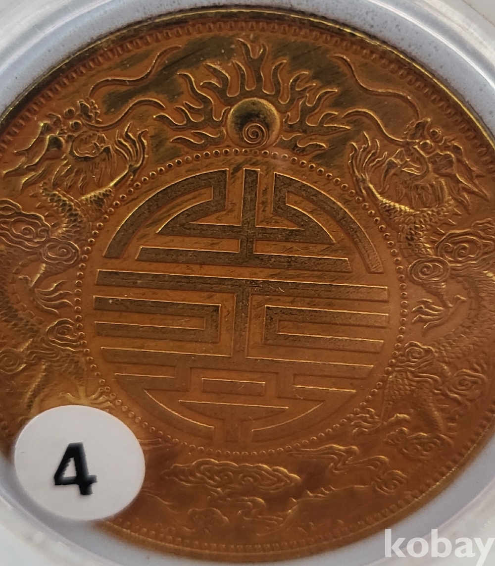 광서원보( (光緒元寶) 광동성조)(廣東省造) 표기가 보이는 금색 주화입니다.