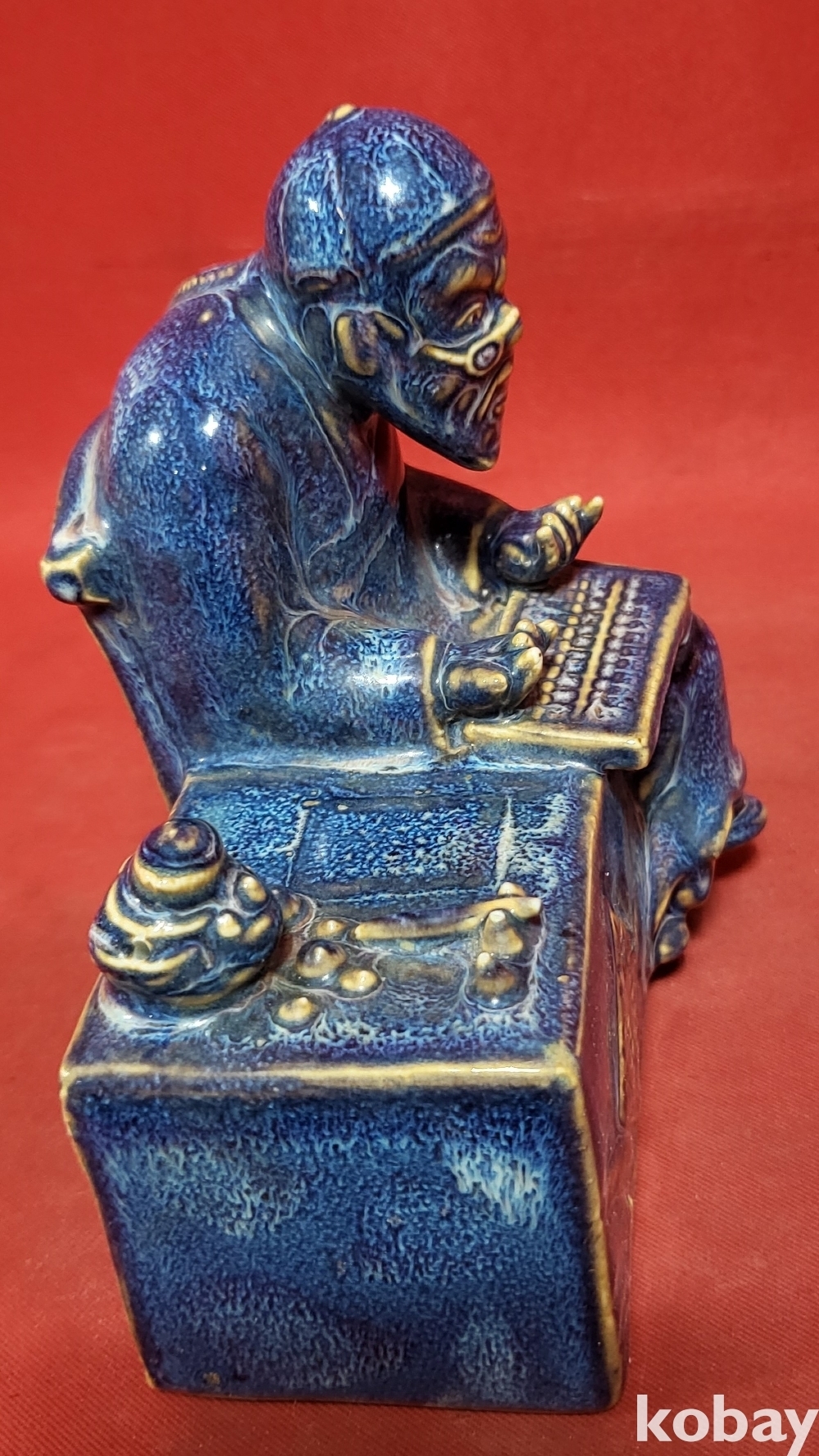 무릎 위에 주판을 놓고 결산을 하는 비단 장사의 모습이 재미 있읍니다,