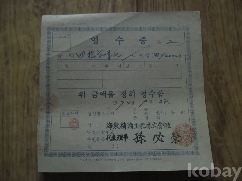 1974년 해동정유(주) 발행 영수증