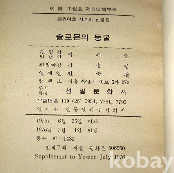 여원 1976년 7월호 별책부록 / 세계 소년소녀 명작소설 - 솔로몬의 동굴.