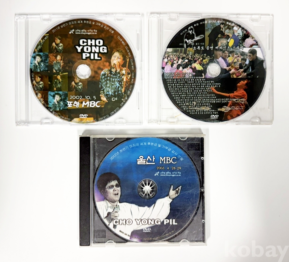 상품 설명 | 조용필 팬클럽 '미지의 세계'에서 후원금 및 기부금 감사 선물로 제작한 DVD 3점 일괄이다. 1) '2002 조용필 포항 MBC' DVD / 2011년 상반기 / 케이스 EX, 음반 NM 2) '2011 SBS 좋은아침 방영 소록도 공연 비하인드 스토리' DVD / 2012년 상반기 / 케이스 EX, 음반 NM 3) '2003 조용필 울산 MBC' DVD / 2012년 하반기 / 케이스 EX, 음반 NM |