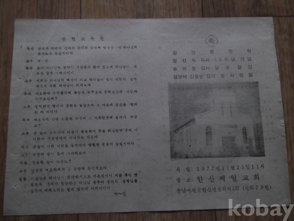 1977년 서천 한산제일교회 성전봉헌예배 주보