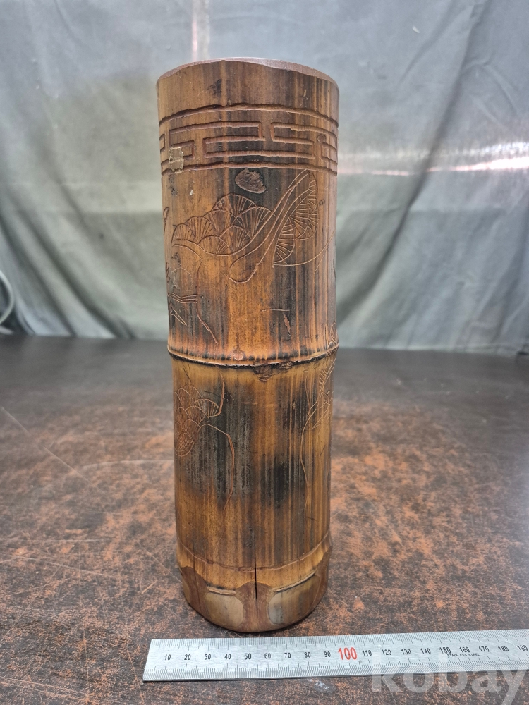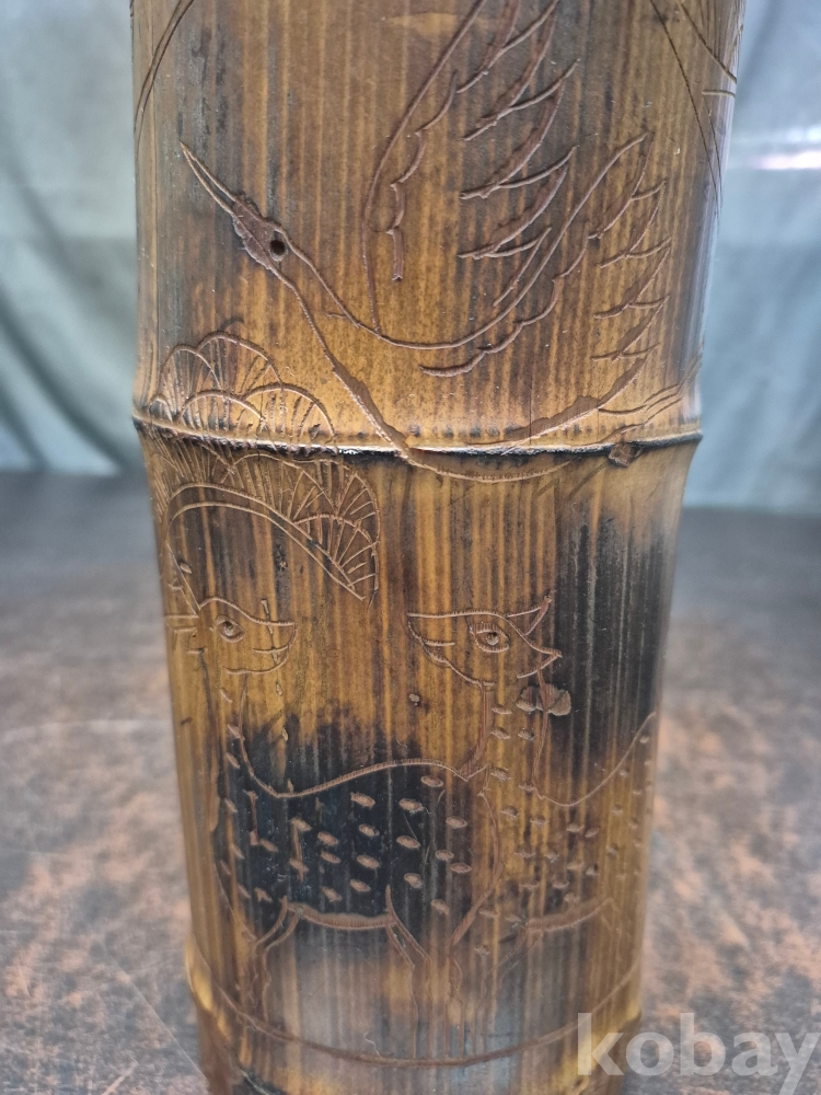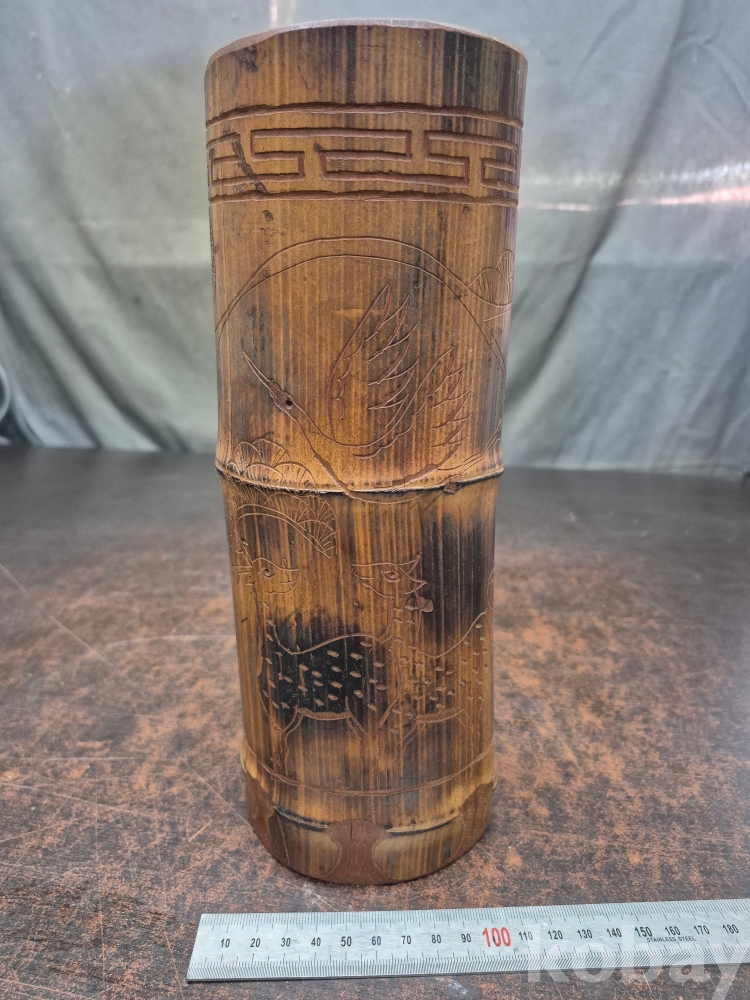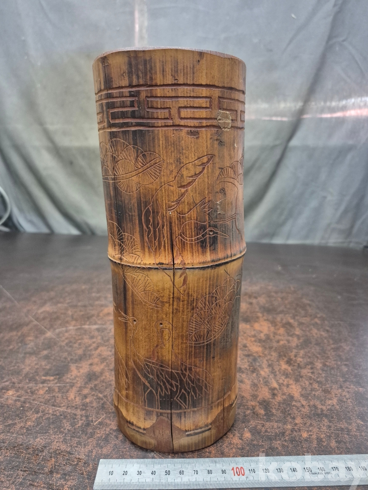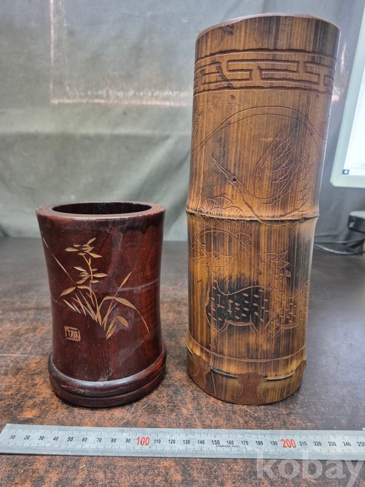 고목으로 만든 난을 깍아 만든 필통 1점과 대나무로 만든 송학과 사슴을 깍아 만든 필통 2점 일괄 10*10*15