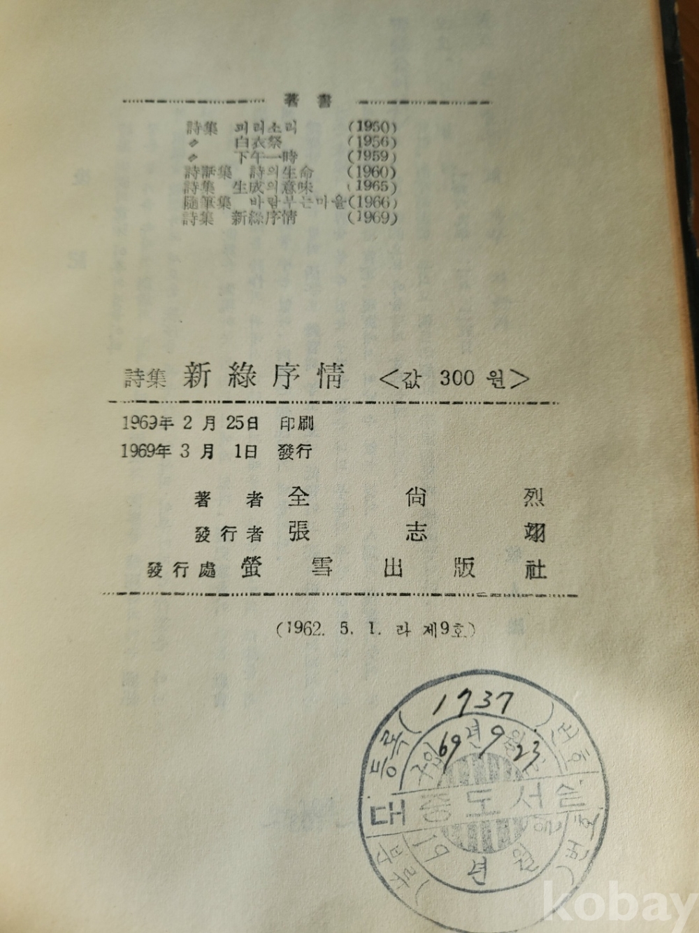 1. 신록서정, 전상렬, 형설출판사, 1969년, 103쪽, 상태 상, 사진 참조