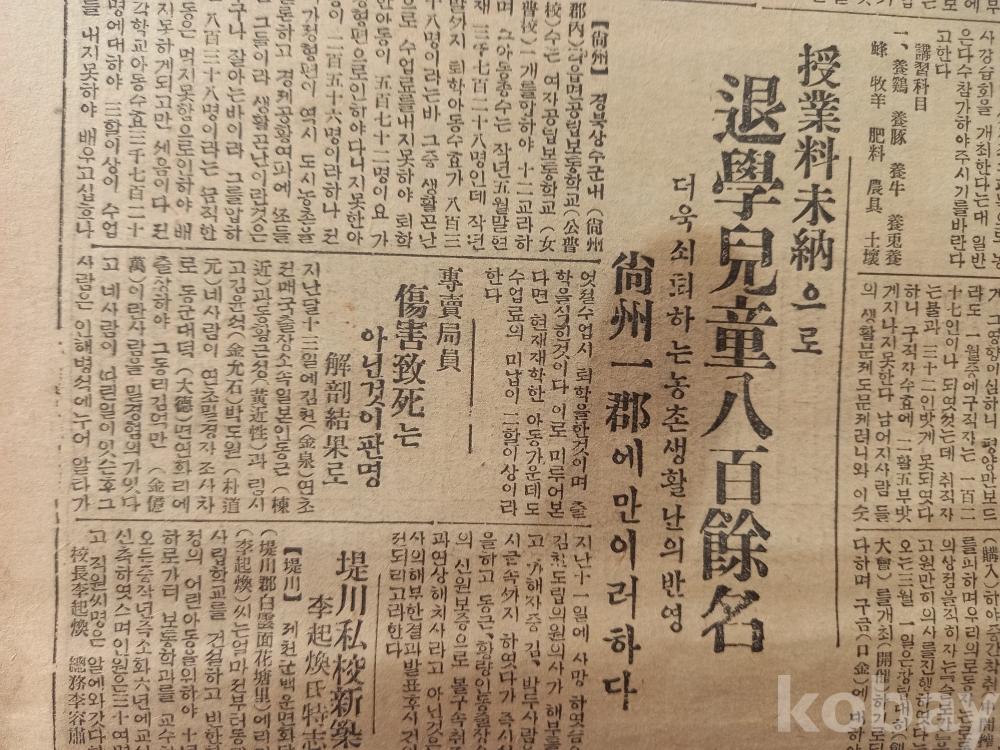 5면: 중앙 좌측 <수업료 미납으로 퇴학 아동 8백여명-더욱 쇠퇴하는 농촌생활난의 반영>이란 기사에서 이러한 것이 <상주 일군에만 이러하다>며 생활곤란으로 학비를 내지 못해 퇴학당하는 학생이 많다는 것을 기사화...