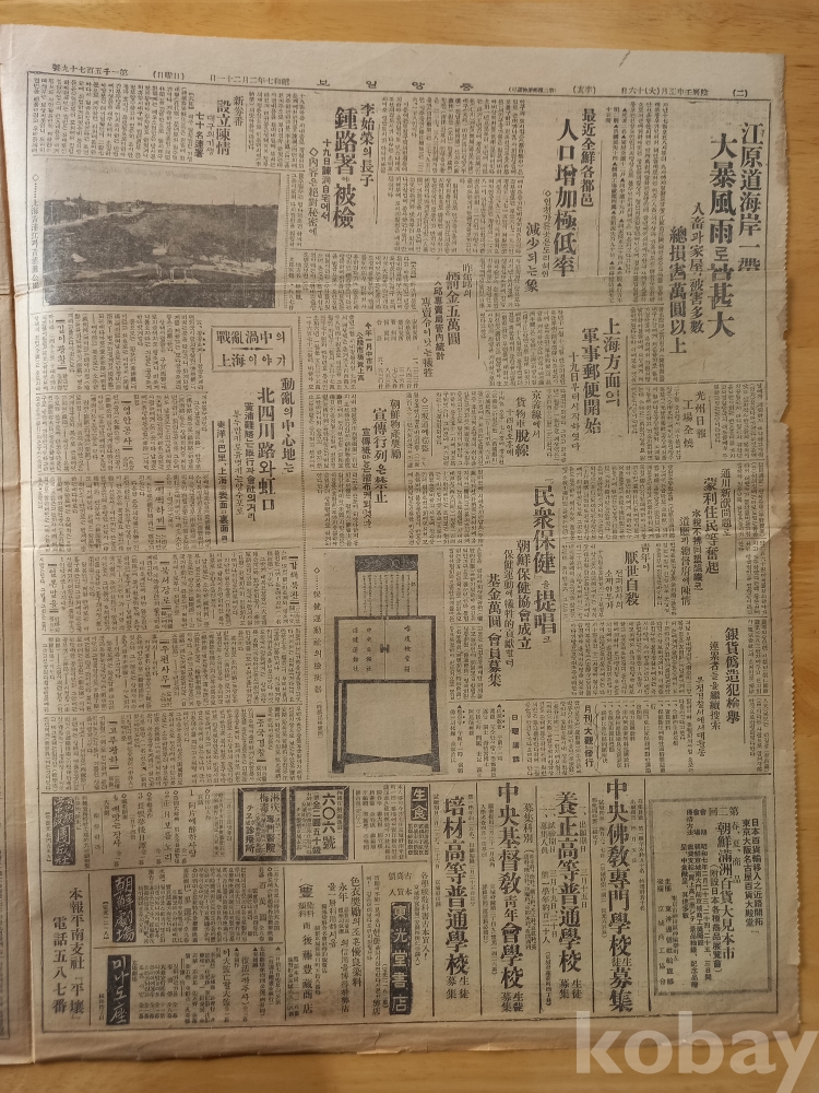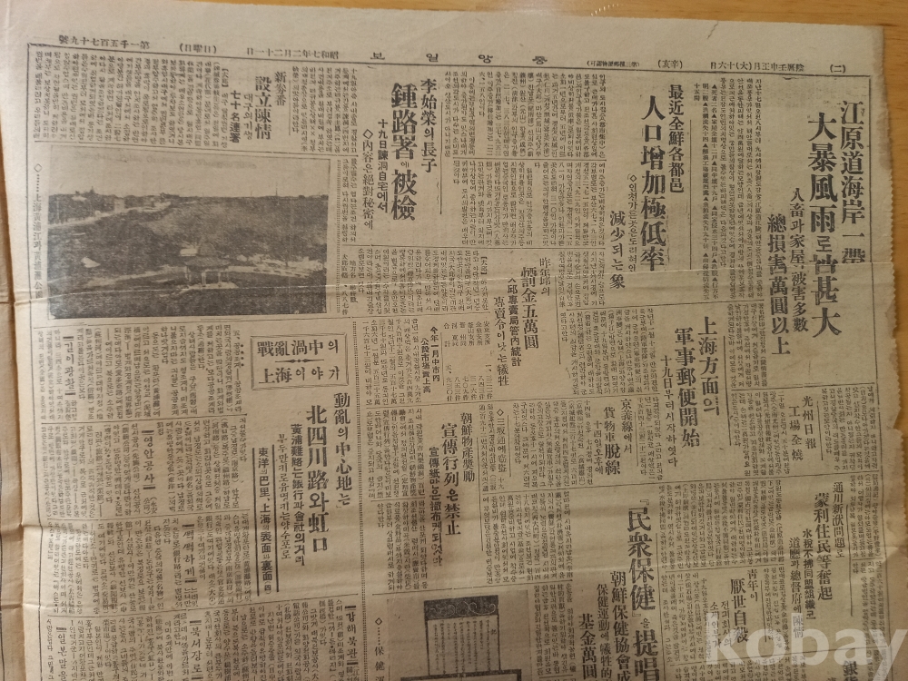 2면: 좌측에 <전란와중의 상해이야기-동란의 중심지는 북사천로와 홍구, 화포난로는 은행과 회사의 거리, 부두만키로 유명키는 양수포로>란 기사에서 <동양의 파리, 상해의 표면과 이면(4)>인 상해가 중일전쟁와중에 있지만 그곳의 형편과 소식을 자세히 전하고 있다.