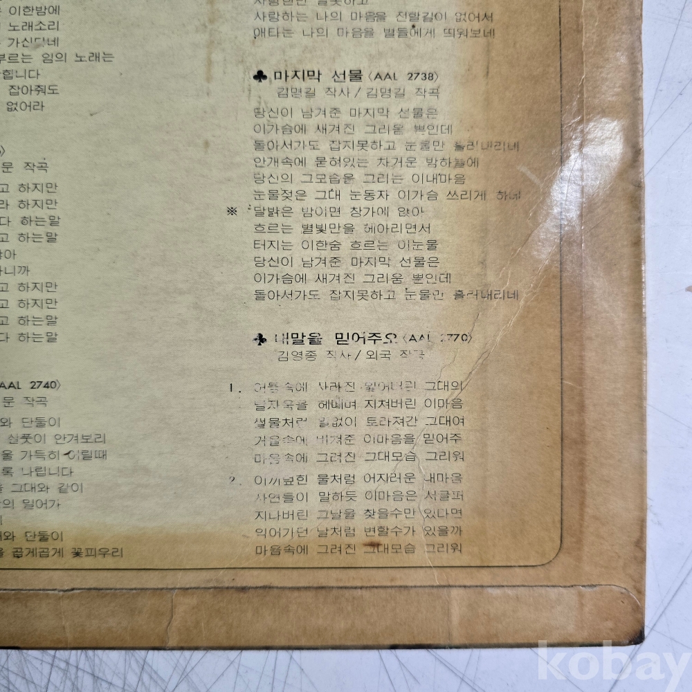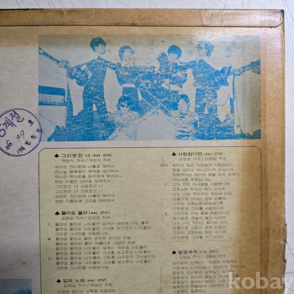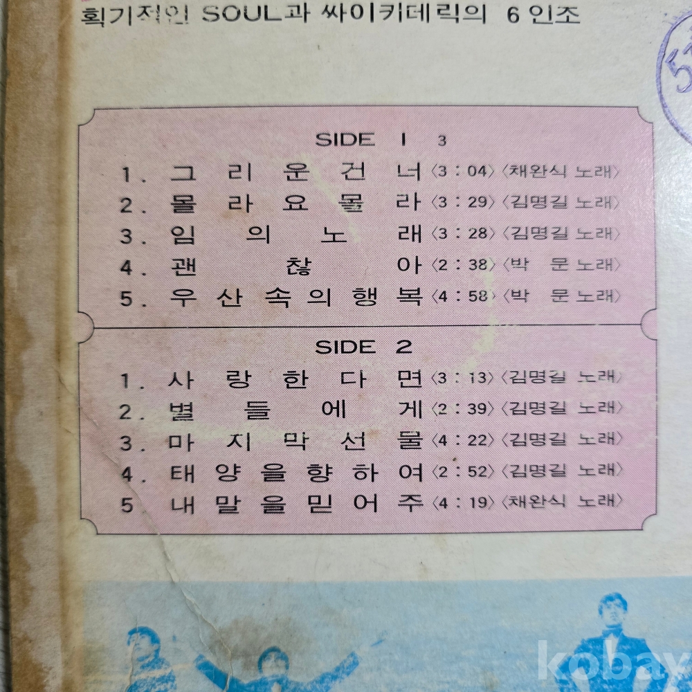 | 자켓상태 | VG : 주름, 접힘, 모서리 찢김 다수 | 음반상태 | VG : 생활 기스 다수, 가벼운 노이즈 존재 | 발매정보 | 초반 | 가사지여부 | 무 |