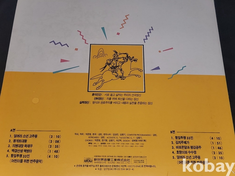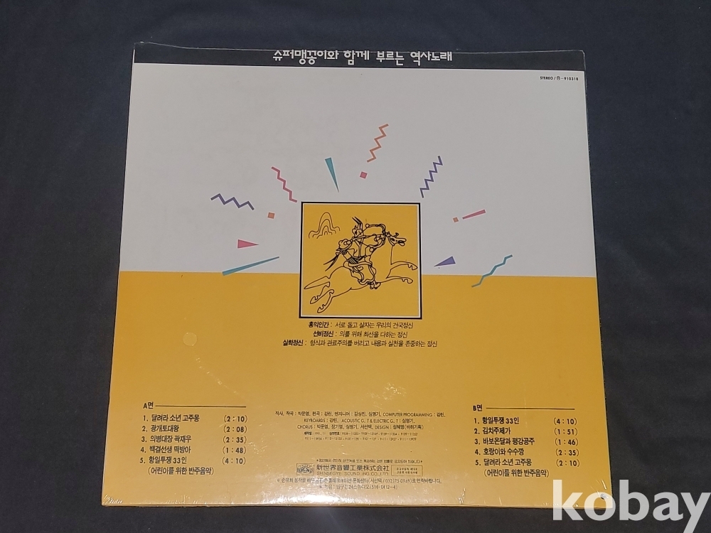 빈티지 1991년 제작 미개봉 LP "슈퍼맹꽁이와 함께 부르는 역사노래 / 달려라 소년 고주몽 항일투쟁 33인"입니다.