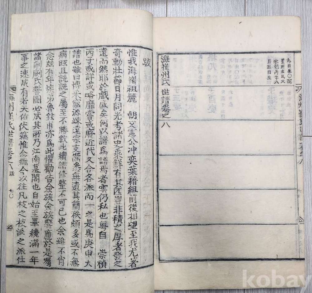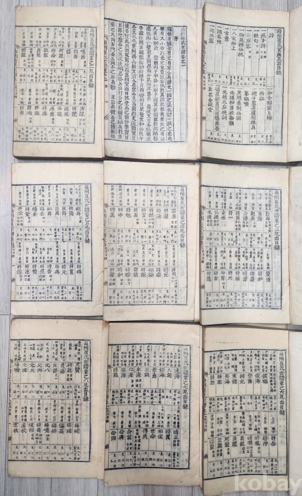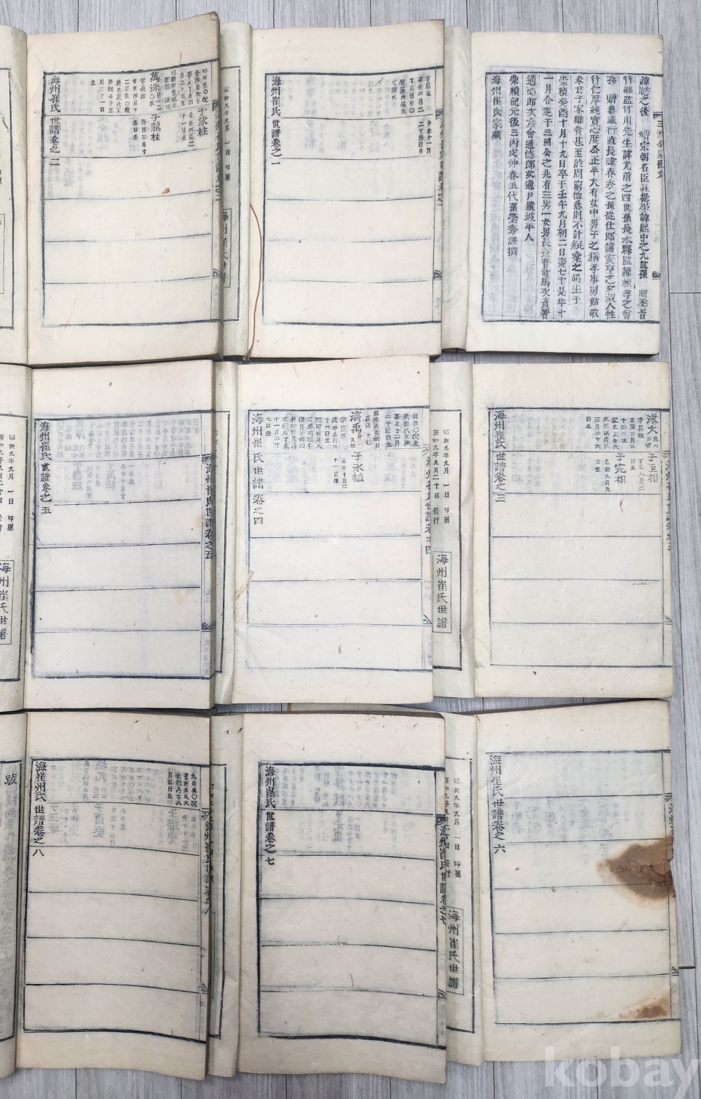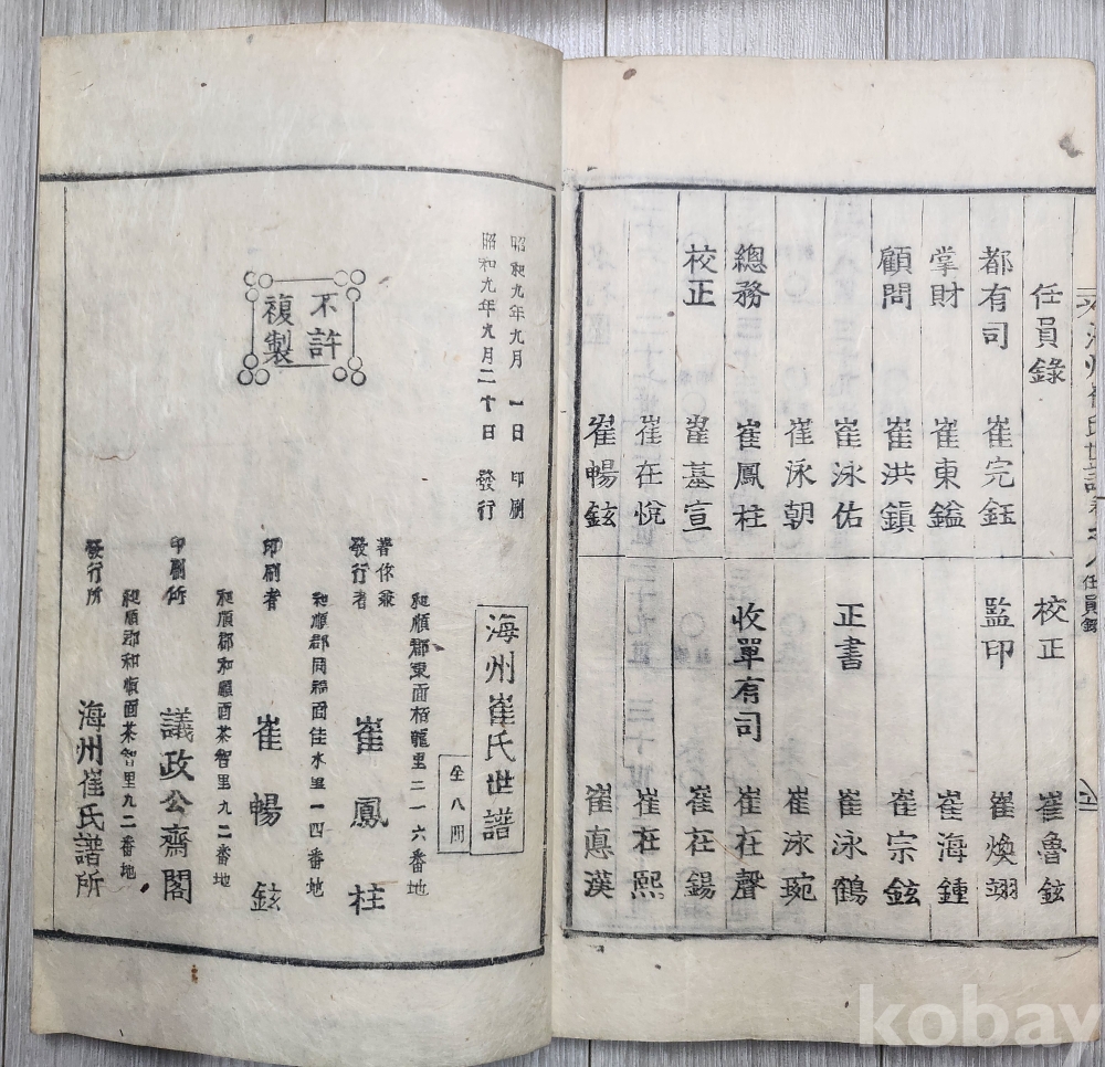 소화9년 1934년 해주최씨세보 9책 완질 입니다 1책은 해주최씨 (가장견출목록)서문 1-8권 8책세보 합9책 완질입니다 서문마지막에 숭정 기원후3 병술 중춘이라 되어 있습니다 책이 매우 두텁습니다 6책 중간끝부분 조금 상한흔적 있습니다 사진 참조 바랍니다