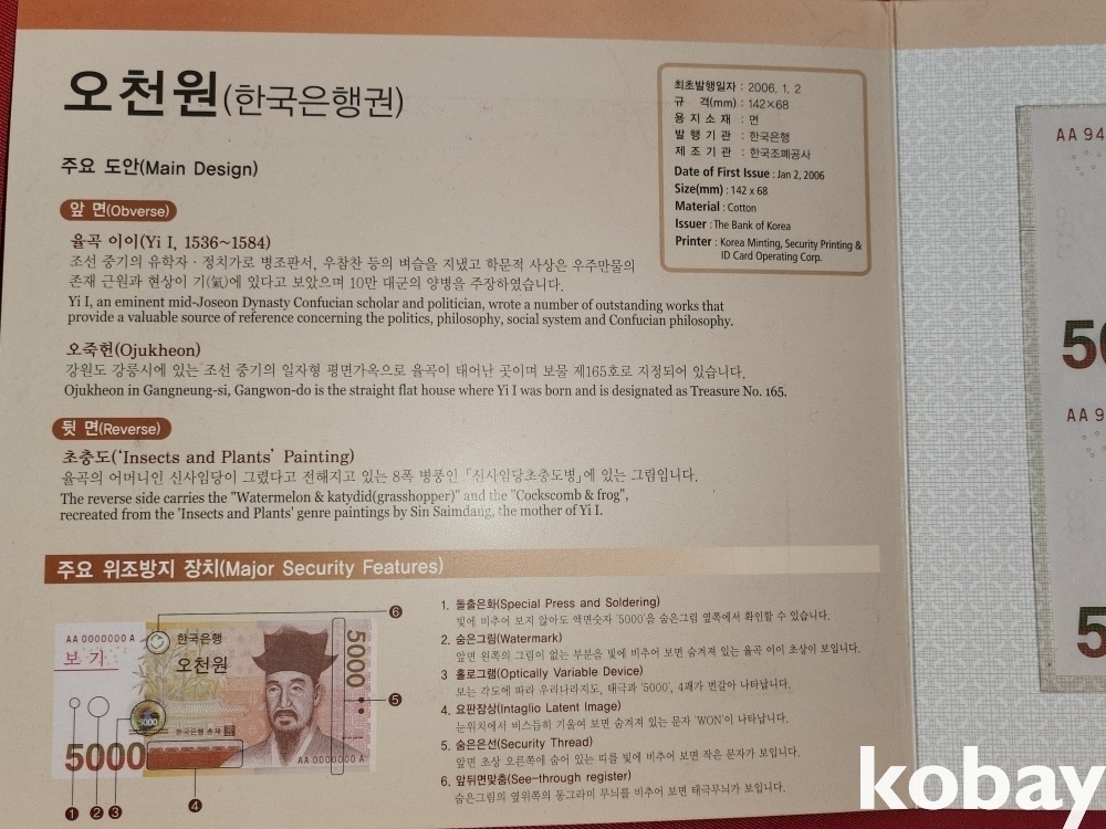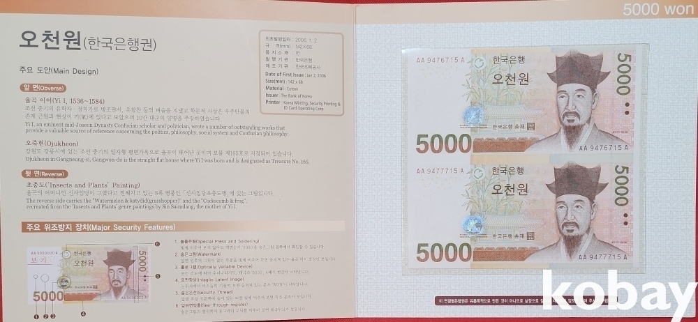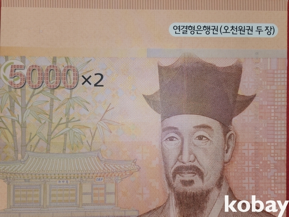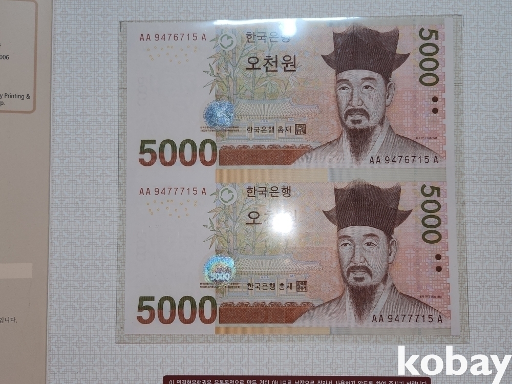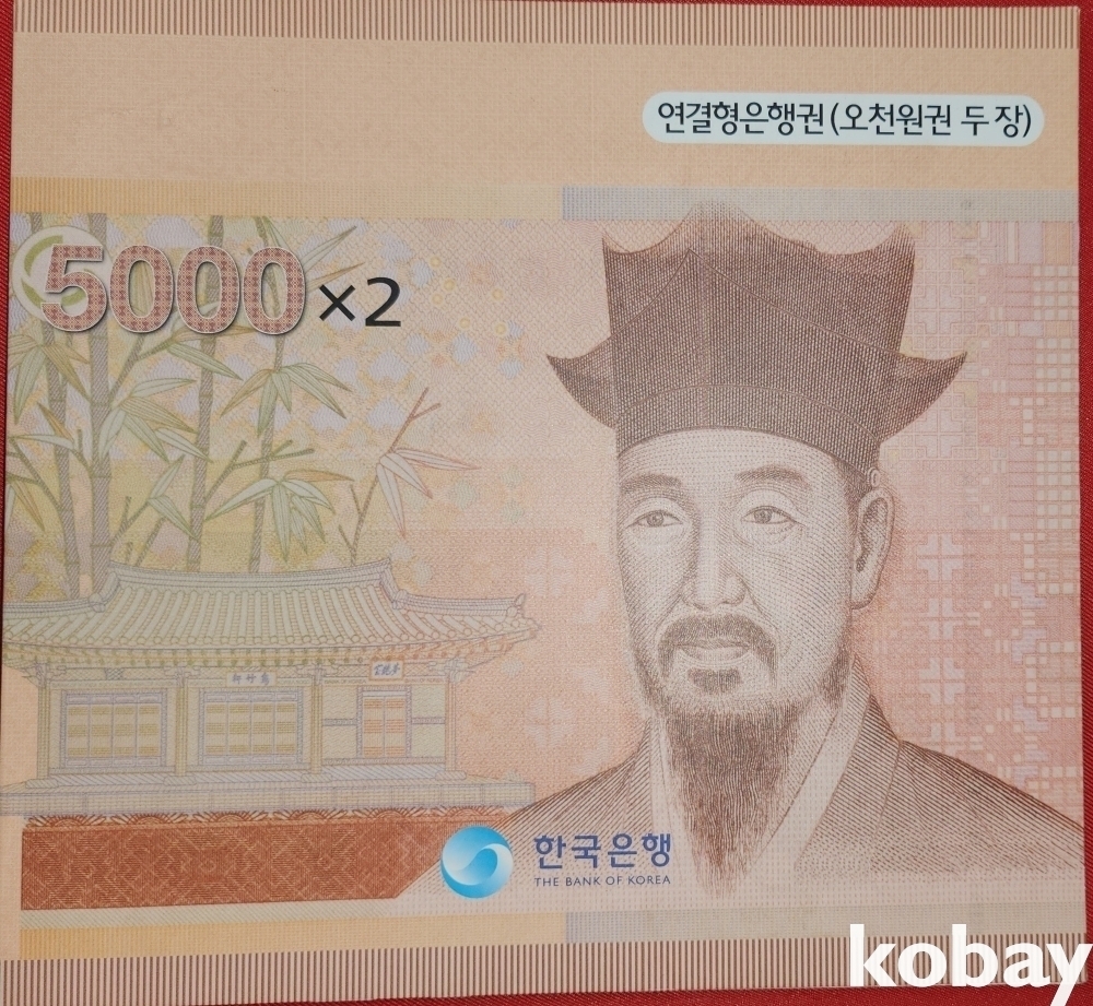 한국은행 발행 같은번호 2장이 한장으로 연결된 액면가격 5000원 연결지폐입니다,