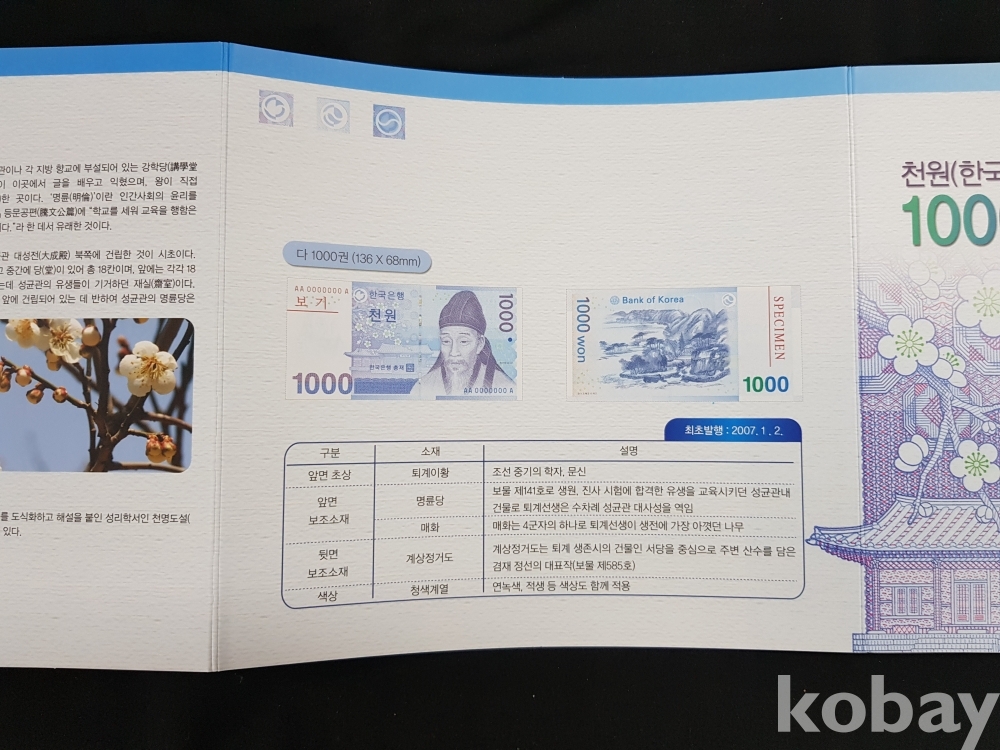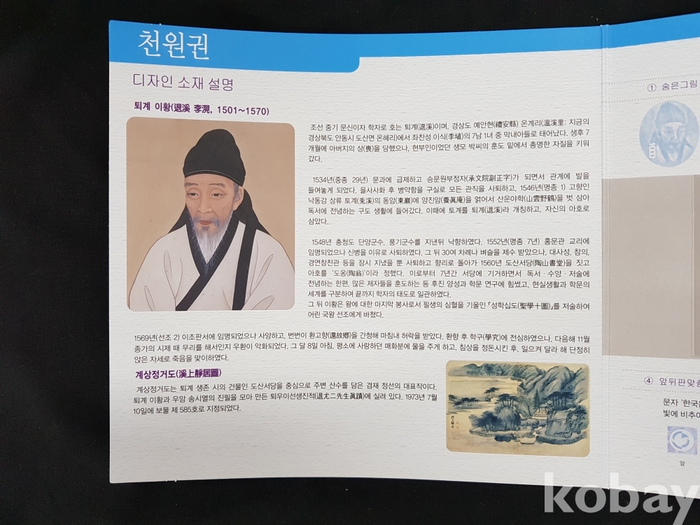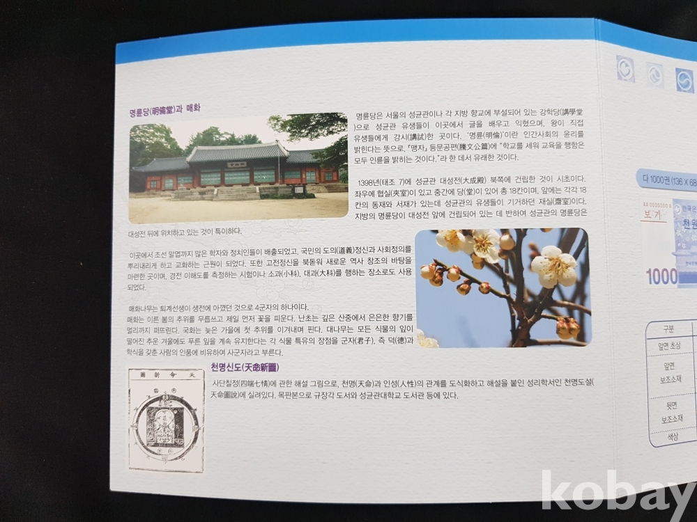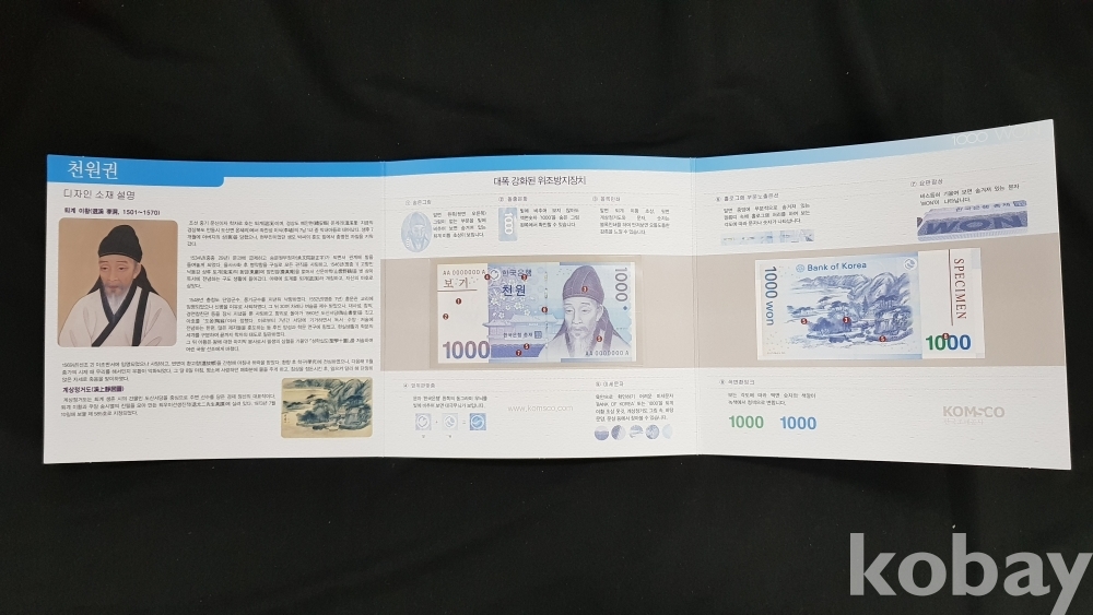- 권종별 화폐첩은 3단으로 접혀있으며, 디자인 소재 설명.