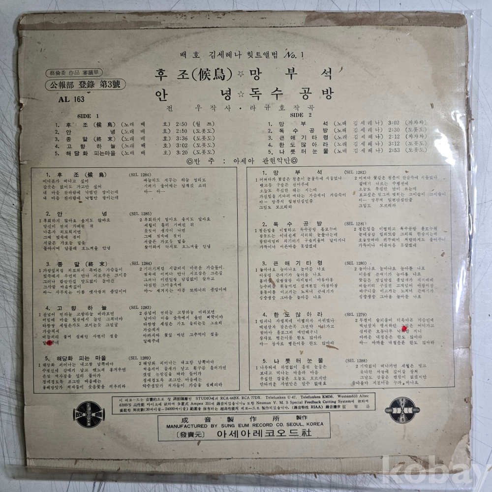 | 자켓상태 | VG : 주름, 접힘, 모서리 찢김 다수 | 음반상태 | VG : 생활 기스 다수, 가벼운 노이즈 존재 | 발매정보 | 초반 | 가사지여부 | 무 |