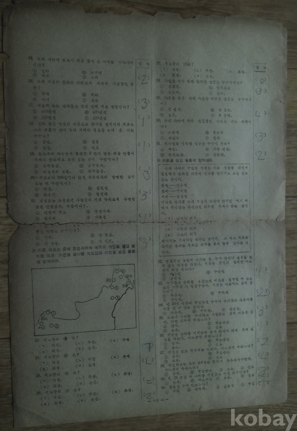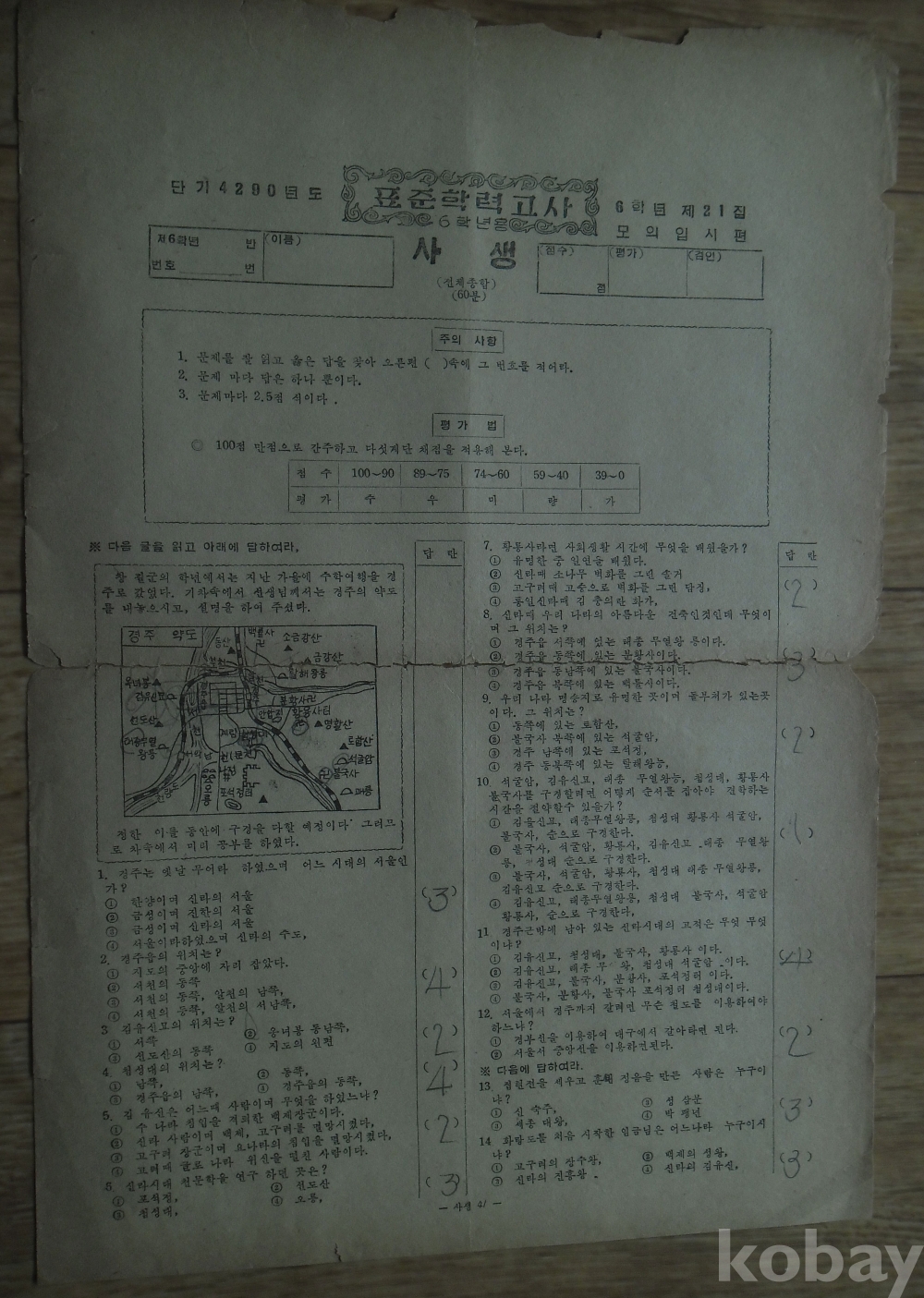 1957년 국민학교 6학년 시험지 표준학력고사 사생